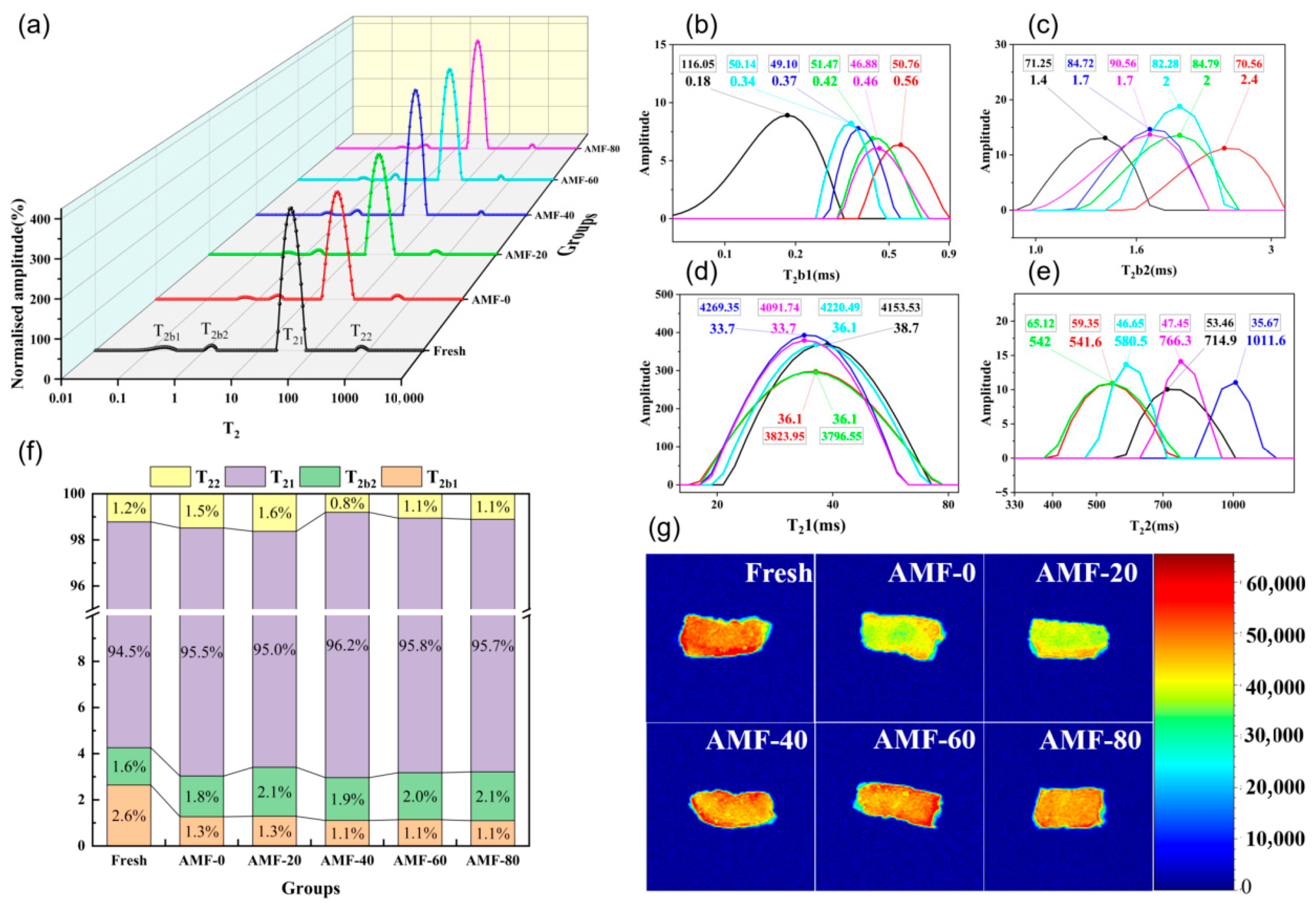 Figure 9e illustrates that the AMF-40 group exhibited the lowest free water content, with a reduced conversion of immobilized water to free water. Regarding overall moisture content, the AMF-40 group closely approximated the moisture content of the fresh group, indicating that less water was lost during the freezing process. This suggests that magnetic field-assisted freezing can effectively minimize water loss. Figure 9f presents the percentages of various moisture contents. It is evident that the AMF-40, AMF-60, and AMF-80 groups contained more immobilized water and less free water, consistent with the earlier analysis of moisture distribution.