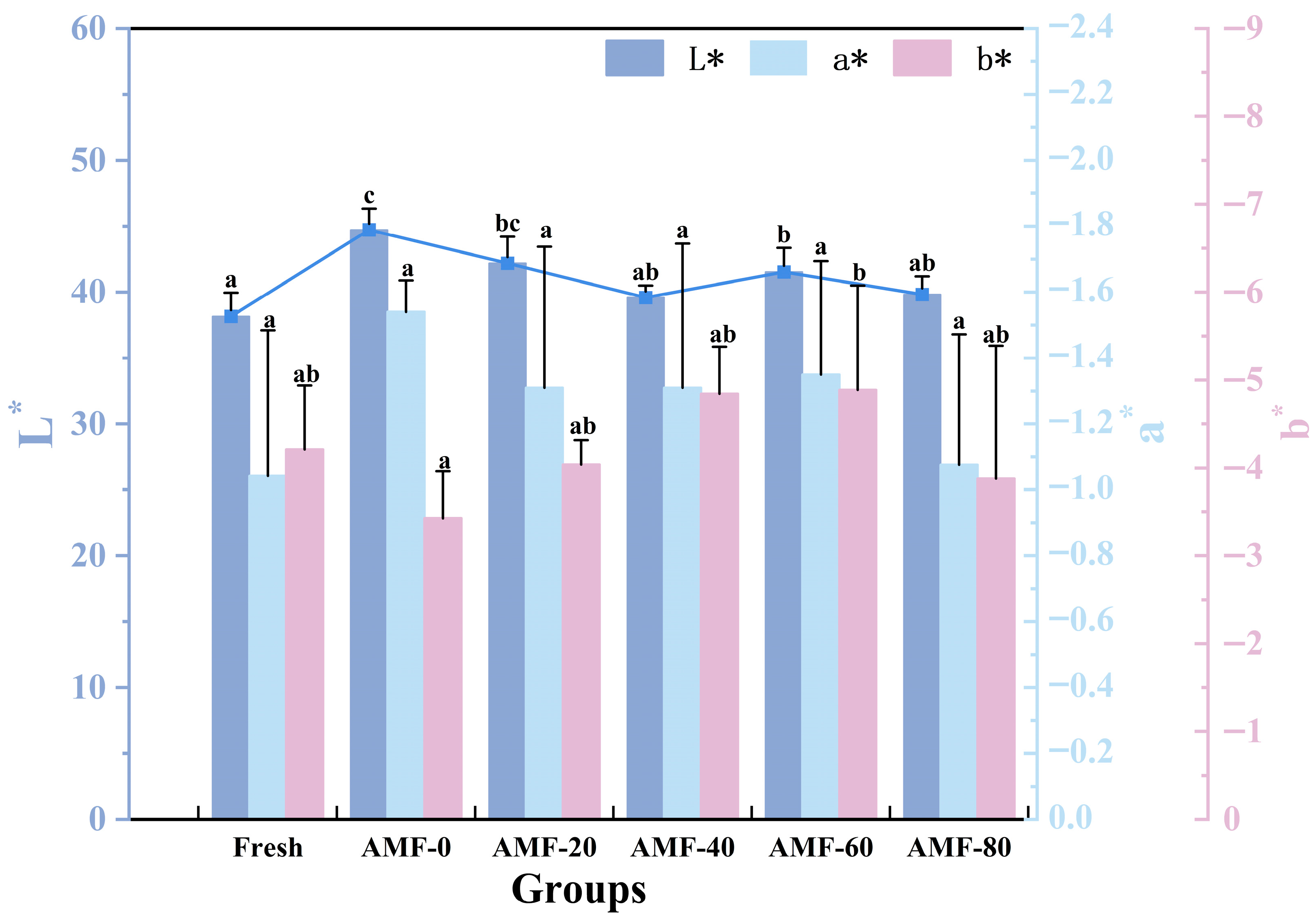 As shown in Figure 10, the L* values increased in all experimental groups compared to the fresh control group. Among them, the AMF-0 group exhibited the highest L* value, indicating that during freezing, a portion of immobilized water was converted into free water, thereby increasing the brightness of Penaeus Japonicus. Conversely, the AMF-40 group had the lowest L* value, suggesting that a magnetic field strength of 40 G was most effective in freezing Penaeus Japonicus with minimal damage to the meat. Jiang et al. [33] reported a similar trend in their study on frozen meat thawing under varying magnetic field strengths, observing a consistent decrease in L* values as magnetic field strength increased. These findings indicate that the magnetic field effectively reduces moisture migration.