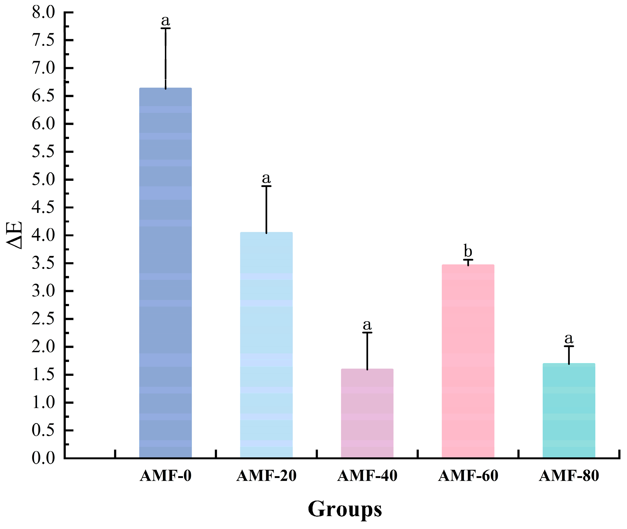 As shown in Figure 11, the ΔE value initially decreased and then increased, with the AMF-40 group exhibiting the minimum value. This indicates that an appropriate magnetic field treatment can effectively maintain the fresh color of frozen fish products. The underlying mechanism may lie in the ability of the magnetic field at this specific intensity to optimize the freezing process by promoting the formation of fine ice crystals, thereby minimizing physical damage to the tissue cells.