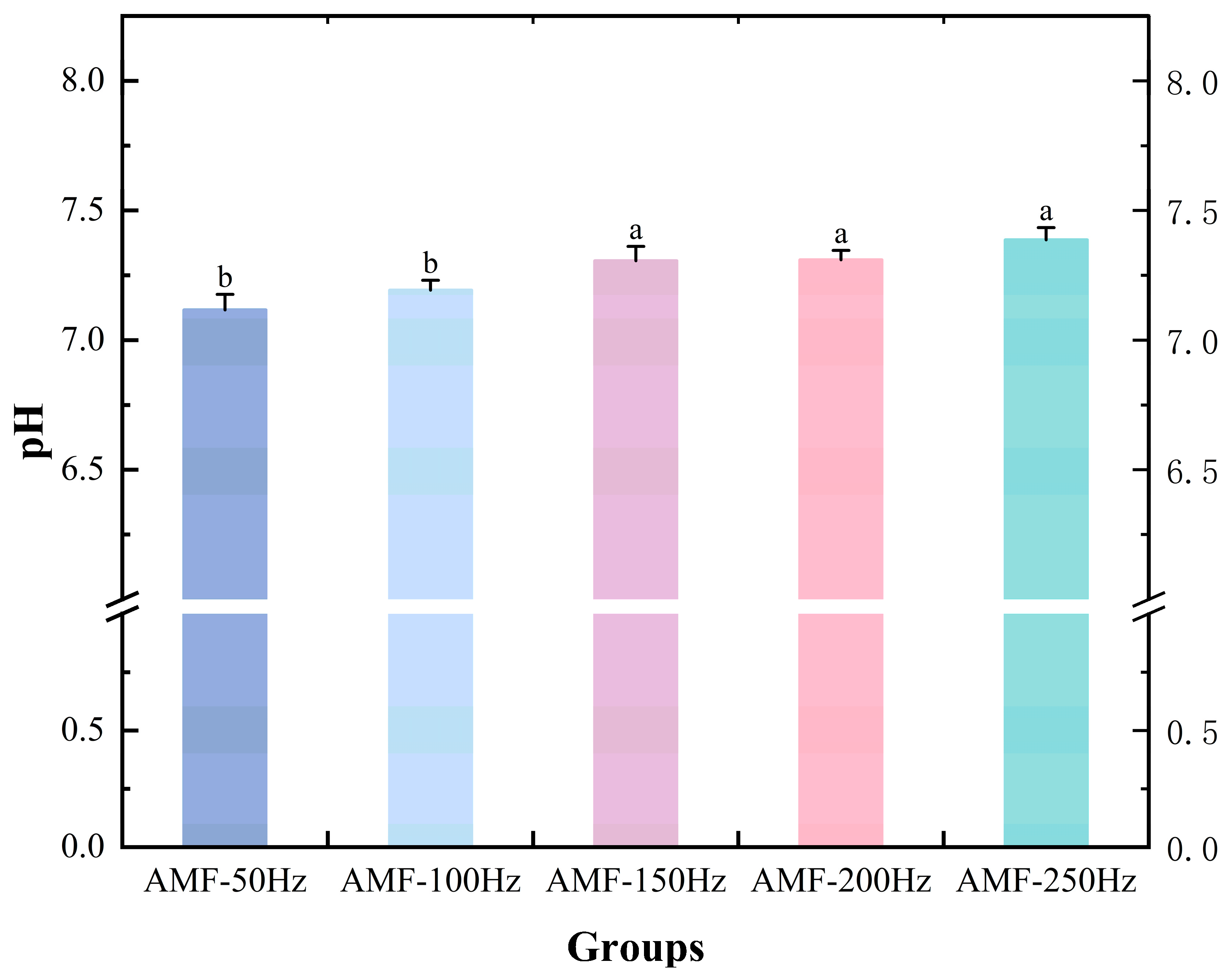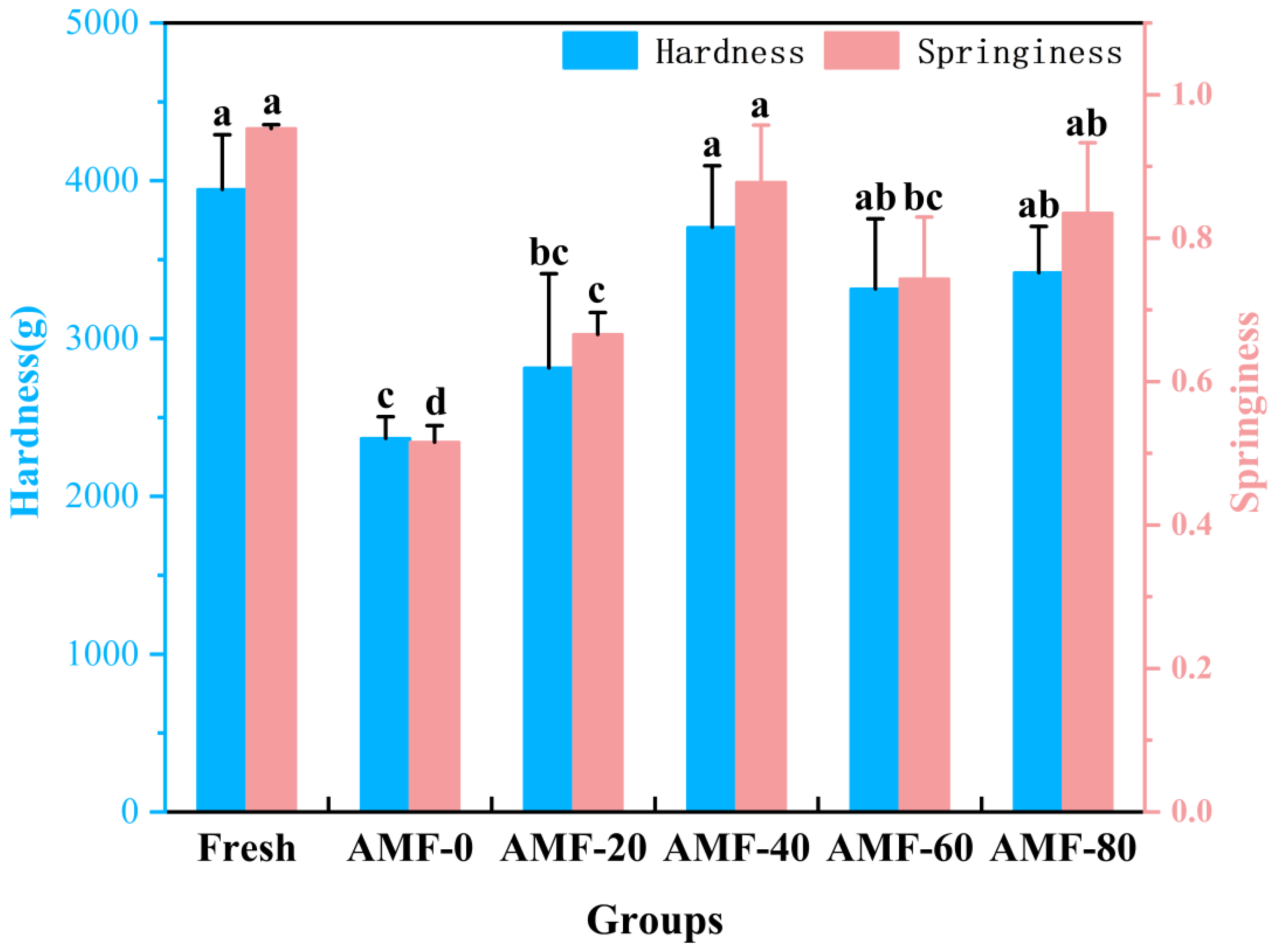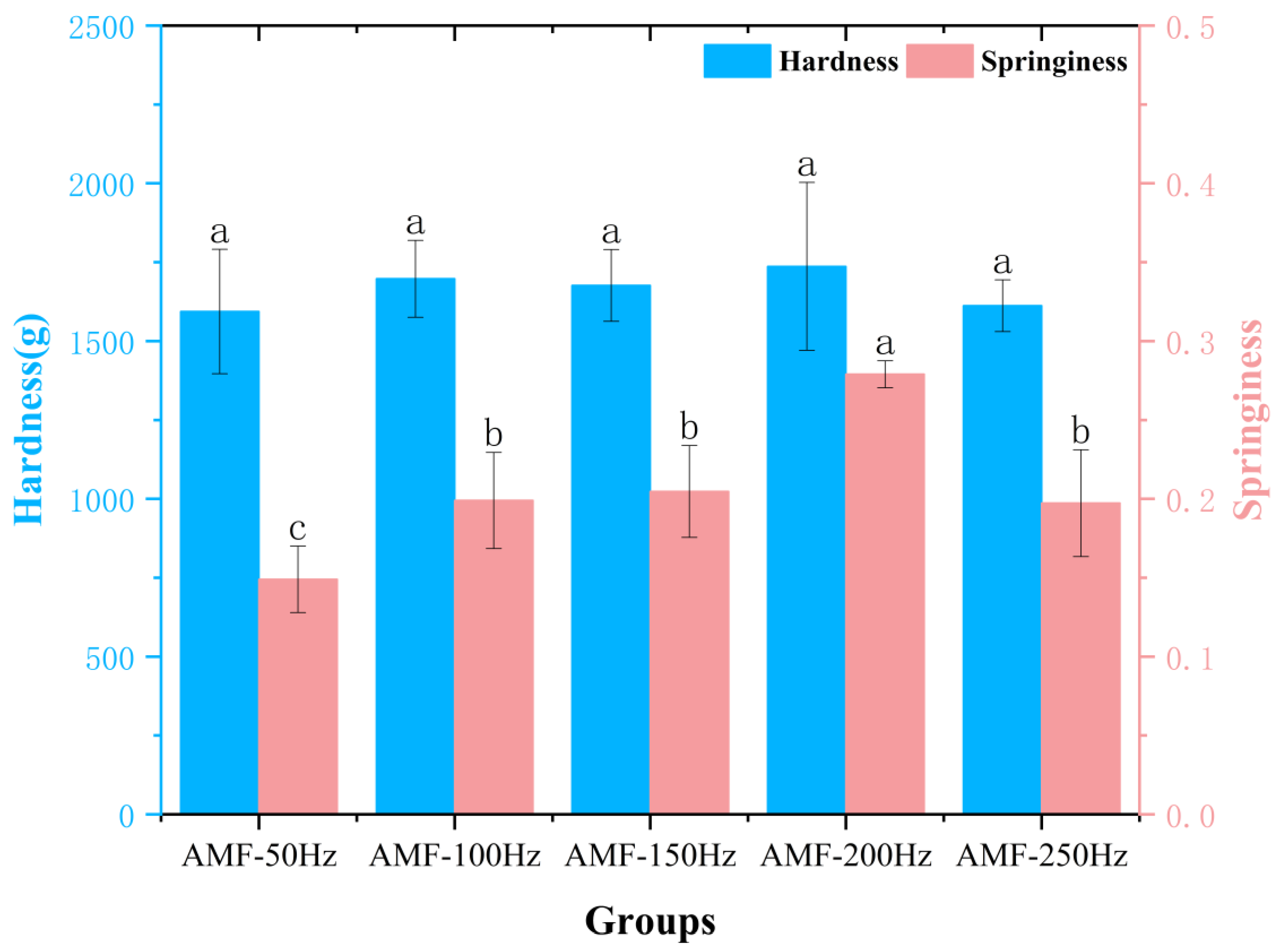 Figure 17. Results of Hardness and springiness of samples after treatment with different magnetic field frequencies. Note: different lowercase letters indicate significant differences (p < 0.05).
