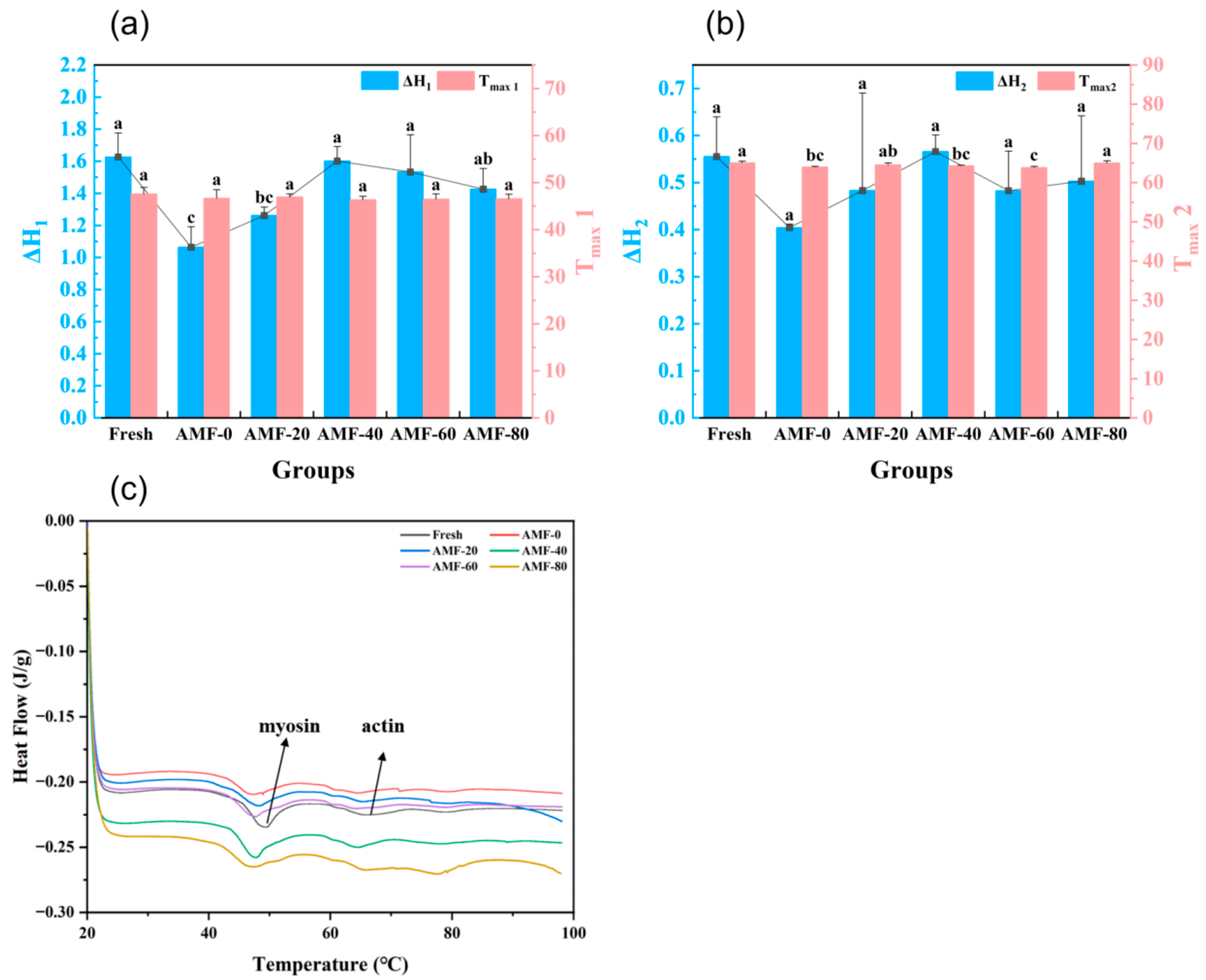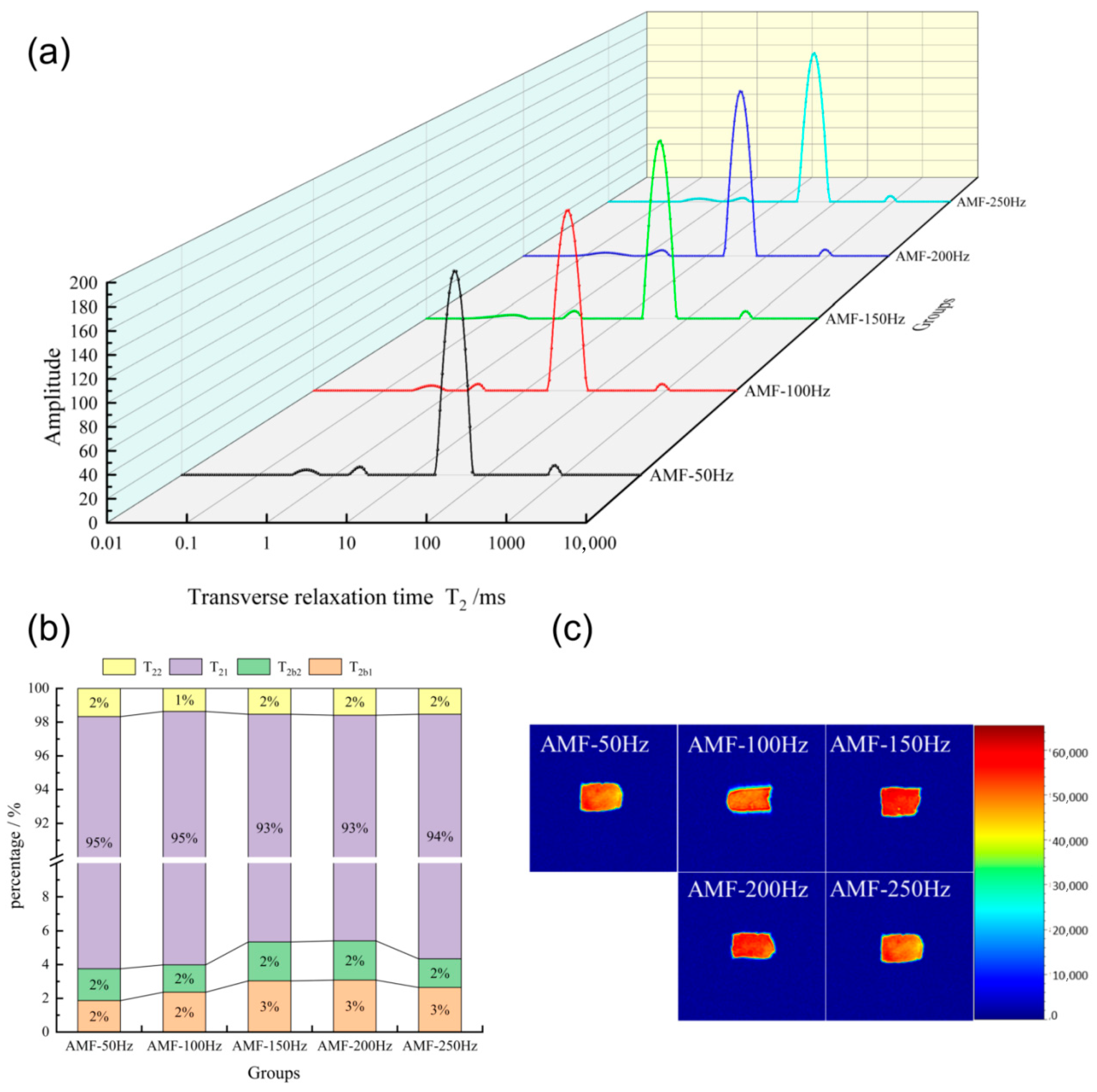 The increase in water mobility can be attributed to the breakdown of the tightly connected myofibrillar network during freezing. Freezing induces the disruption of some hydrogen and ionic bonds in myofibrillar proteins, leading to the exposure of hydrophobic groups as a result of mechanical damage to the protein molecules. Consequently, some of the bound water is transformed into free water, and a portion may even be lost during thawing [20]. Figure 9d demonstrates that the AMF-40 group exhibited a 10.4% higher immobilized water content compared to the AMF-0 group. The AMF-40 group showed the lowest T2 value, indicating that the magnetic field’s influence during freezing helps mitigate damage to the muscle fiber network, thereby reducing water migration. Wei et al. [30] conducted a study to examine the effect of gradient magnetic fields on freezing quality, employing low-field nuclear magnetic resonance (NMR) to analyze the water distribution within the samples. The results revealed that the application of magnetic fields significantly reduced water migration in tilapia.