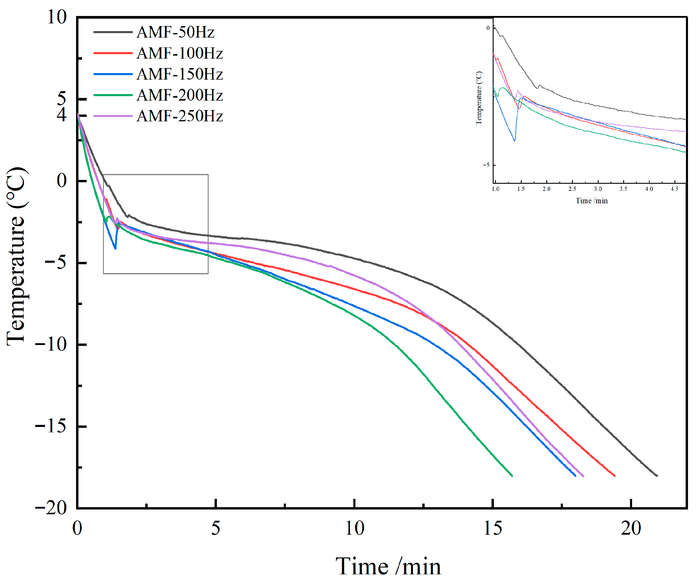 During the subcooling stage, a rapid decrease in temperature occurs, primarily due to the freezing of the majority of water within the muscle tissue. No significant difference (p > 0.05) was observed in the subcooling time between the groups. The shortest subcooling time was recorded in both the AMF-60 and AMF-40 groups. Overall, the use of magnetic field-assisted freezing significantly reduced both the phase transition time and the total freezing duration.