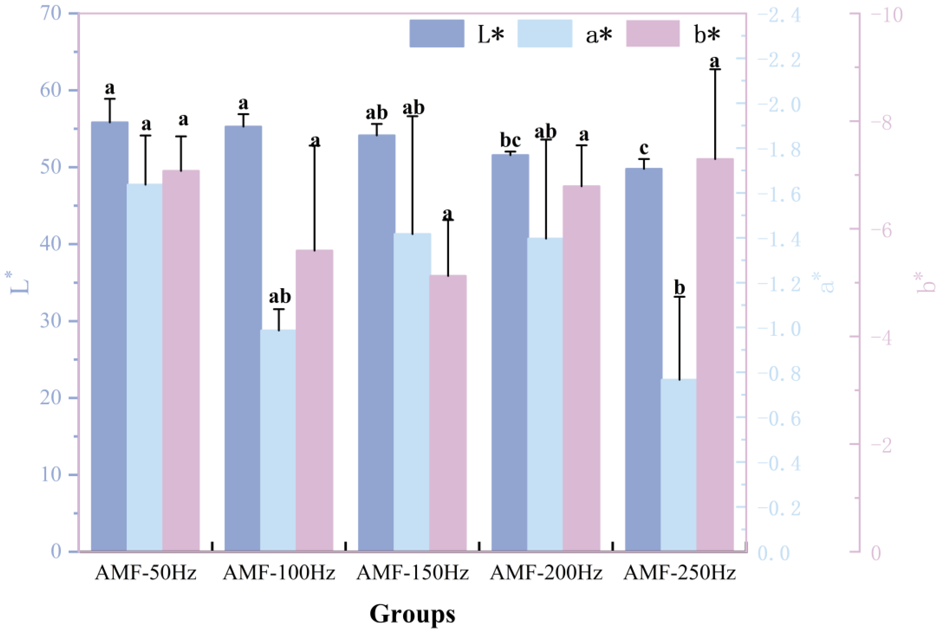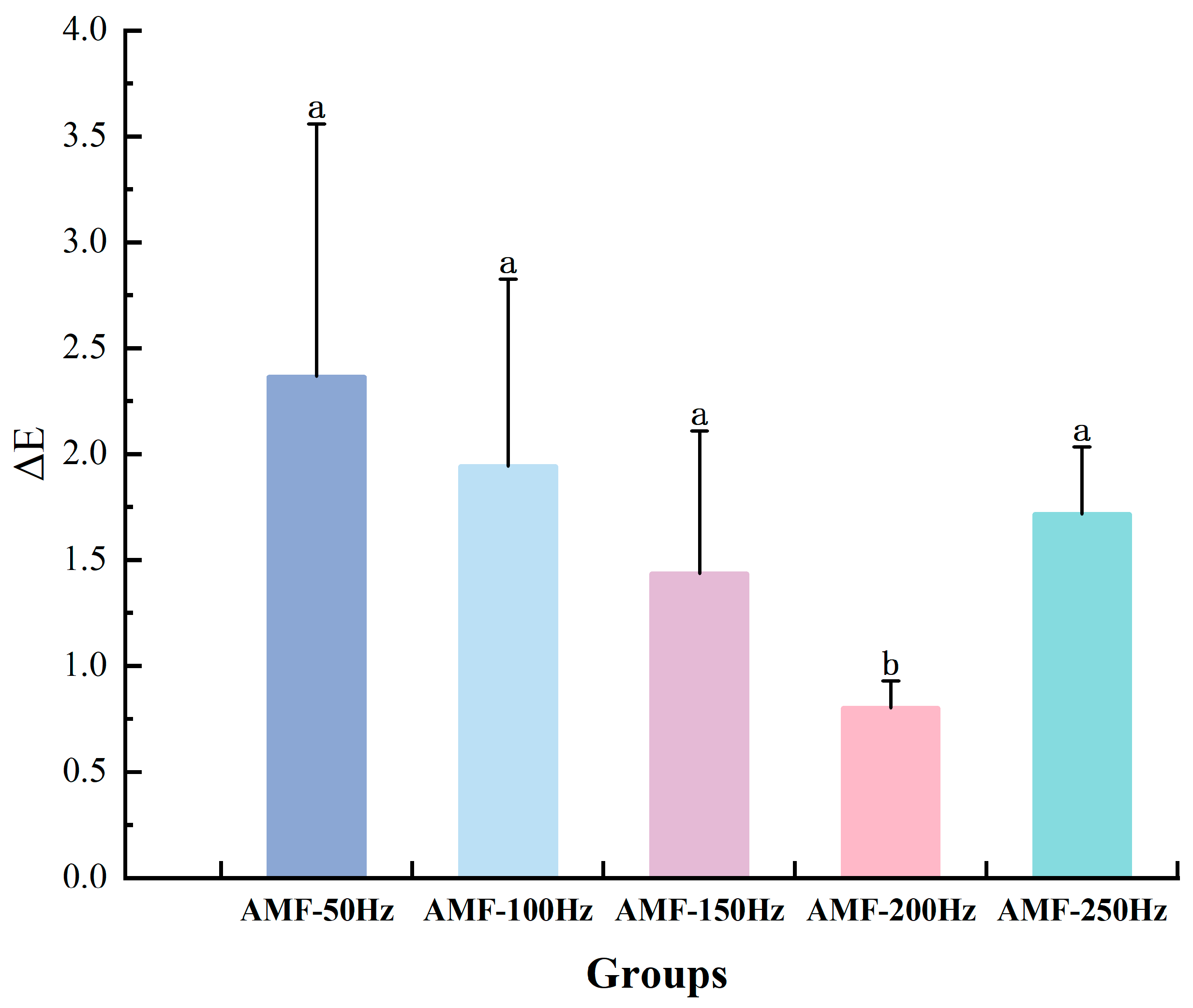 Figure 15. Color difference analysis of samples treated with different magnetic field frequencies. Note: different lowercase letters indicate significant differences (p < 0.05).