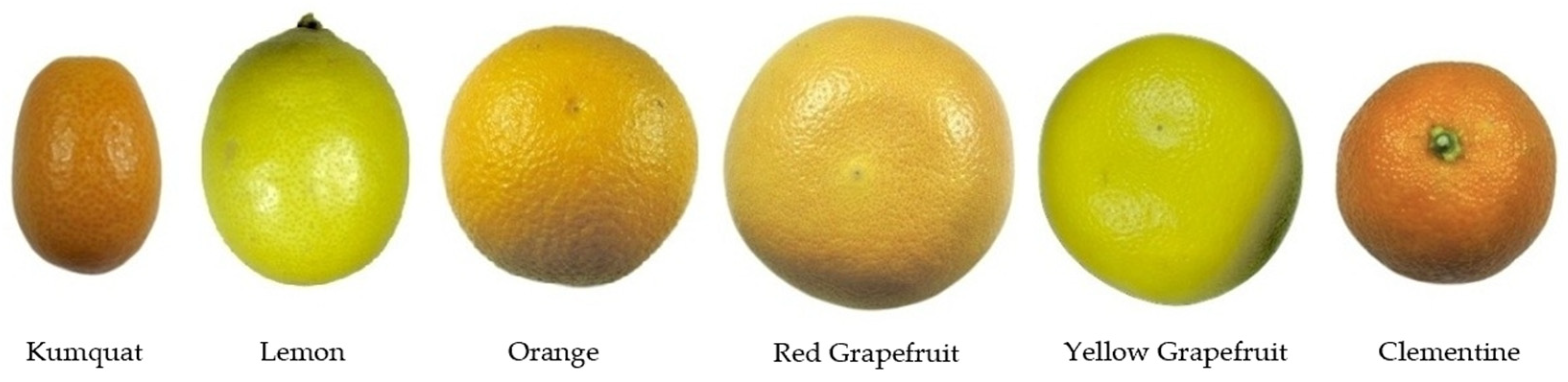 - Qin, J.; Burks, T.F.; Kim, D.G.; Bulanon, D.M. Classification of Citrus Peel Diseases Using Color Texture Feature Analysis. In Proceedings of the Food Processing Automation Conference Proceedings, Providence, RI, USA, 28–29 June 2008; American Society of Agricultural and Biological Engineers: St Joseph, MI, USA, 2008. [Google Scholar]