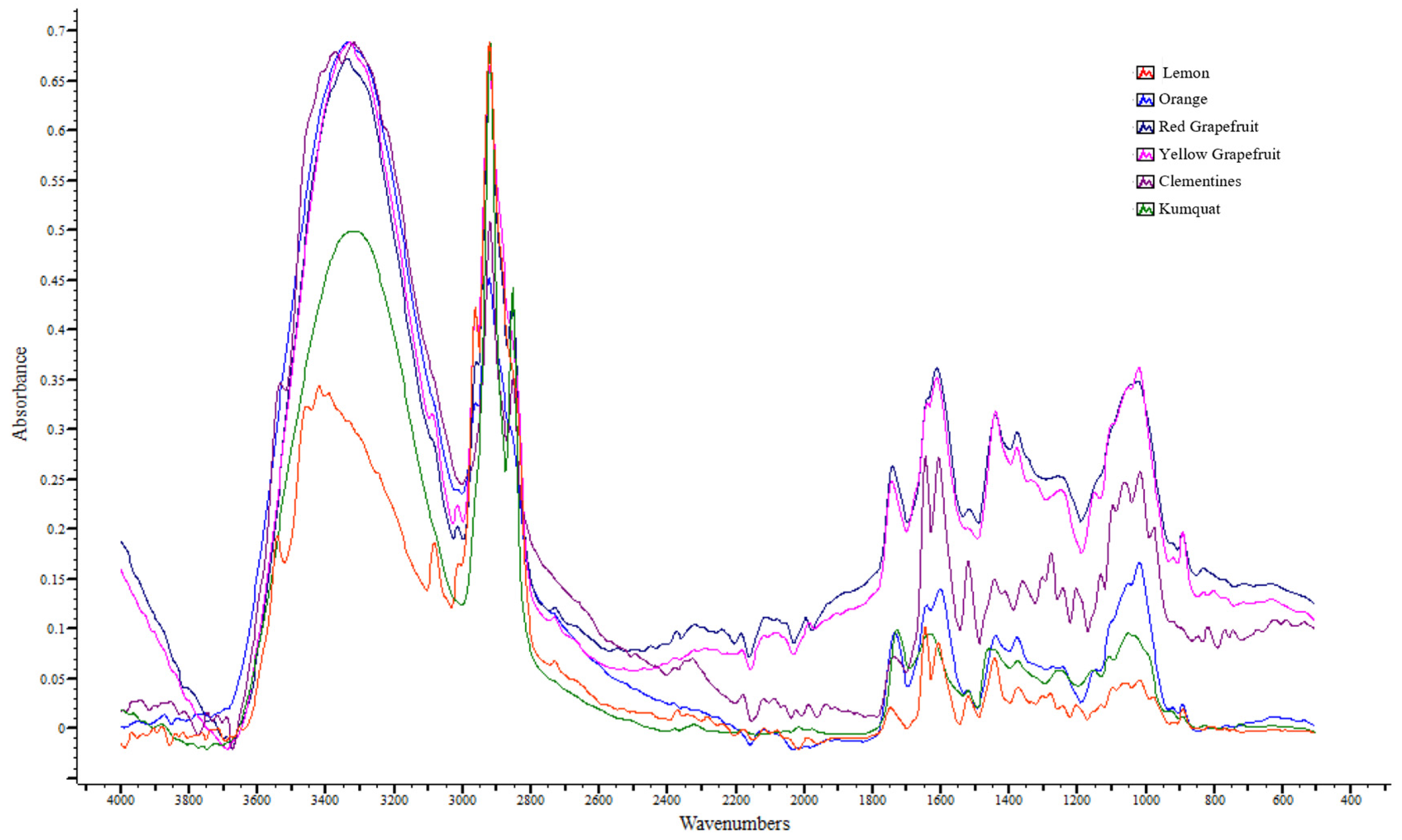| Regions (cm−1) | Orange | Lemon | Red Grapefruit | Yellow Grapefruit | Clementine | Kumquat |