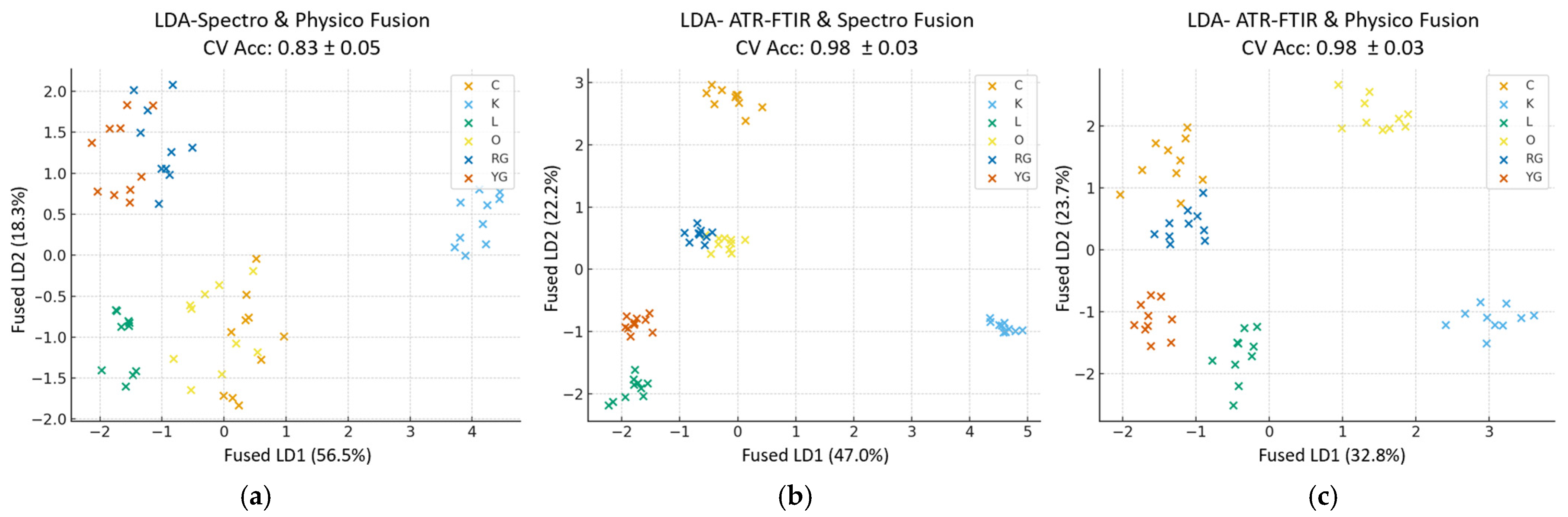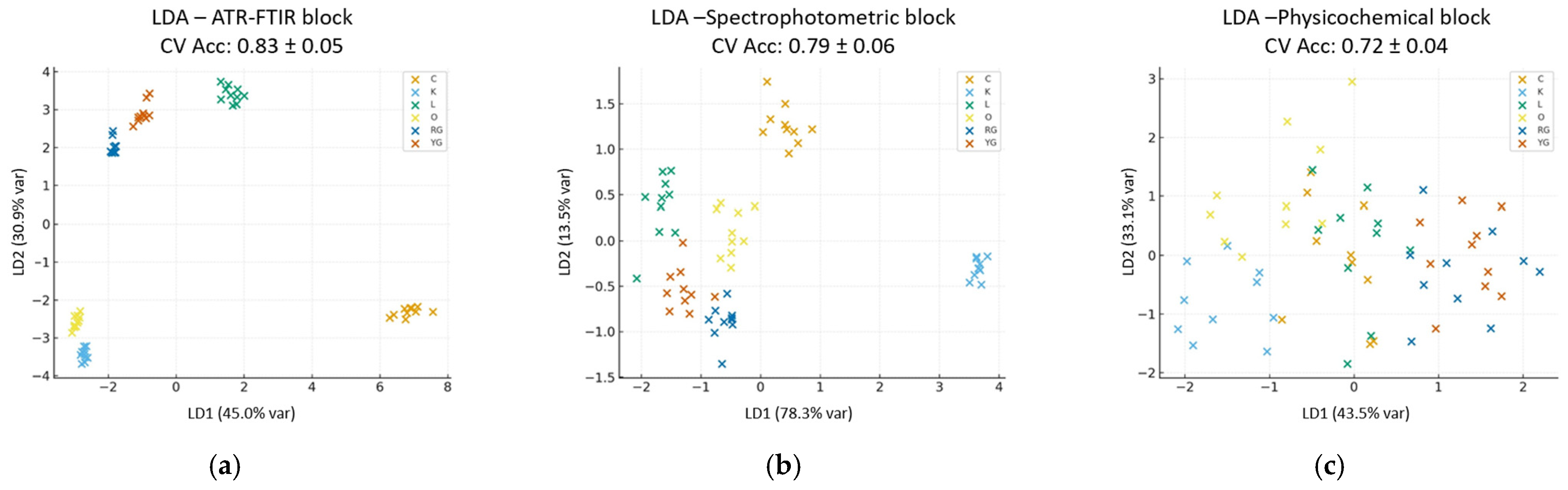 - Ioannou, A.G.; Kritsi, E.; Sinanoglou, V.J.; Cavouras, D.; Tsiaka, T.; Houhoula, D.; Zoumpoulakis, P.; Strati, I.F. Highlighting the Potential of Attenuated Total Reflectance—Fourier Transform Infrared (ATR-FTIR) Spectroscopy to Characterize Honey Samples with Principal Component Analysis (PCA). Anal. Lett. 2023, 56, 789–806. [Google Scholar] [CrossRef]
