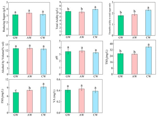 Physicochemical parameters of the three alcoholic beverages. Different lowercase letters indicate significant differences (p < 0.05). TS: reducing sugars; TA: titratable acidity; TA/TS: titratable acidity to reducing sugars; ABV: alcohol by volume; TSO2: total sulfur dioxide; FSO2: free sulfur dioxide; VA: volatile acidity. GW: grape wine; AW: apple cider; CW: compound fermented beverage. Significant differences were observed through one-way ANOVA and post hoc Tukey HSD test (p < 0.05). n = 3.