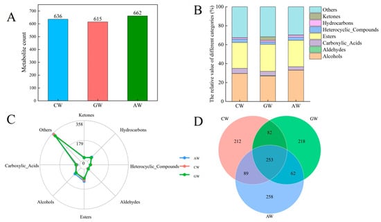 Flavor compounds in the three alcoholic beverages. (A) Number of volatile compounds across samples. (B) Relative content of compound classes. (C) Radar chart showing volatile distribution by chemical class. (D) Venn diagram of shared and unique compounds.
