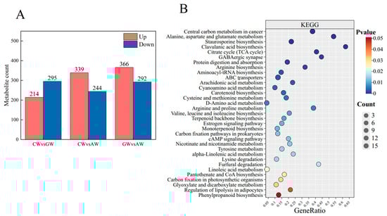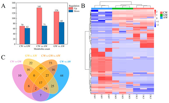 PLS-DA further confirmed clear separation between groups (Table S4). Model validation parameters for pairwise comparisons were as follows: GW vs. AW (R2X = 0.636, R2Y = 1.000, Q2 = 0.973), CW vs. AW (R2X = 0.635, R2Y = 1.000, Q2 = 0.970), and CW vs. GW (R2X = 0.587, R2Y = 1.000, Q2 = 0.963). All permutation tests showed Q2 regression line intercepts on the positive y-axis (Figure S5, Table S4), validating model robustness for discriminating sample types. Using thresholds of FC > 2, VIP > 1, and p-value < 0.05, 1750 differential metabolites were identified. Pairwise comparisons revealed 509 (214 up/295 down) in CW vs. GW, 583 (339 up/244 down) in CW vs. AW, and 658 (366 up/292 down) in GW vs. AW (Figure 4A).