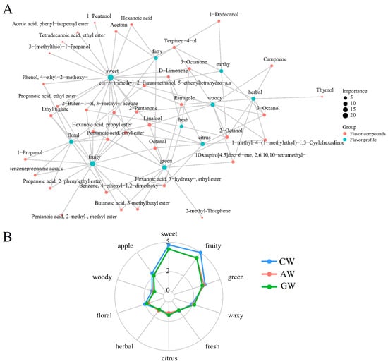 Network analysis of differential VOCs and associated sensory attributes. (A) Correlation network depicting interactions among CW, AW, and GW groups. Larger blue nodes represent sensory attributes connected to more VOCs; larger red nodes indicate VOCs contributing to multiple sensory attributes. (B) Sensory profiles derived from VOCs identified in the three wine types.