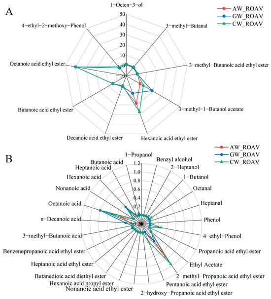 rOAV radar spectra of aroma compounds in three types of alcoholic beverages. (A) Representing compound rOAV > 1; (B) representing compound 0.1 < rOAV < 1.