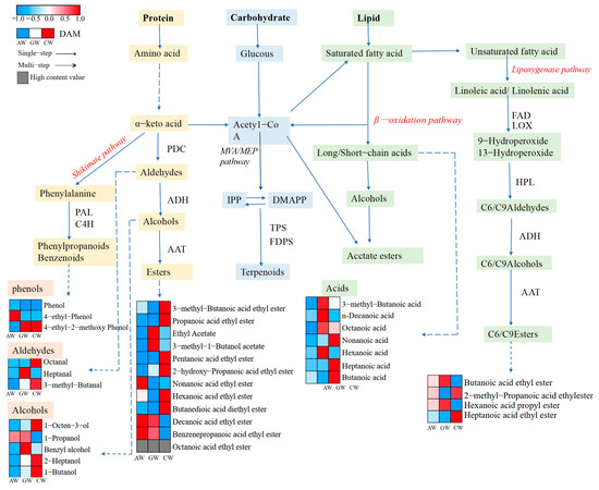 Fatty acids are primary precursors for aroma volatiles in fruit. Both β-oxidation and the lipoxygenase (LOX) pathway are key enzymatic systems for fatty acid catabolism, generating C1–C20 straight-chain aldehydes, alcohols, ketones, acids, and esters that significantly impact fruit aroma [38]. This is consistent with findings in Baijiu fermentation, where extracellular proteolytic enzymes and β-oxidation were pivotal for generating raspberry and creamy flavors [39]. β-oxidation plays a fundamental role during fermentation, primarily occurring in peroxisomes in plants [40]. Fatty acids are activated to acyl-CoAs, which are sequentially shortened, requiring FAD, NAD, and free CoA. Acyl-CoAs can be reduced to aldehydes and then to alcohols through alcohol dehydrogenase (ADH), enabling alcohol acyltransferase (AAT) to produce esters [41]. Ester production depends on the supply of acyl-CoAs from β-oxidation and alcohols. AAT’s broad specificity for alcohols and acyl-CoAs explains the diversity of esters synthesized [42]. Key esters like ethyl hexanoate and ethyl octanoate were significantly more abundant in CW, providing direct evidence of their formation via β-oxidation followed by AAT catalysis. The enrichment of branched-chain esters like ethyl 2-methylpropanoate in CW suggests that compound fermentation alters the acyl-CoA pool, guiding AAT towards the synthesis of a more diverse ester profile.