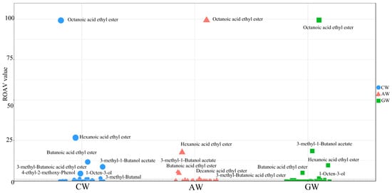 The main flavor compounds with rOAV > 1 are the ones that contribute significantly to the overall flavor (Figure 8, Table S5). The rOAVs of the main flavor compounds in AW, GW, and CW are as follows: 6 (3-methyl-1-butanol acetate, hexanoic acid ethyl ester, decanoic acid ethyl ester, butanoic acid ethyl ester, octanoic acid ethyl ester), 5 (1-Octen-3-ol, 3-methyl-1-butanol acetate, hexanoic acid ethyl ester, butanoic acid ethyl ester, octanoic acid ethyl ester), 8 (1-Octen-3-ol, 3-methyl-butanal, 4-ethyl-2-methoxy-phenol, 3-methyl-butanoic acid ethyl ester). Ethyl ester, 3-methyl-1-butanol acetate, hexanoic acid ethyl ester, butanoic acid ethyl ester, octanoic acid ethyl ester). The increase in the number of main flavor compounds in CW (compound fermented beverage) indicates that the compounds that contribute significantly to the overall flavor of CW type are concentrated in the combined fermentation of apples and grapes.