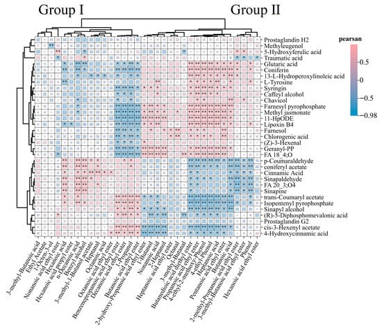 Correlation between VOCs and metabolites. ** indicates a significant level of p < 0.01; * indicates a significant level of p < 0.05. Horizontal axis: VOCs. Vertical axis: metabolites.