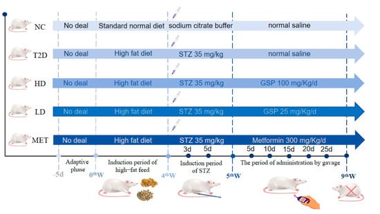 Model establishment. Normal control group (NC); Diabetes model group (T2D); GSP high-dose intragastric group (HD); GSP low-dose intragastric group (LD); Metformin gavage group (MET).