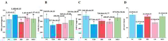 Oxidative stress plays a crucial role in the onset and development of diabetes mellitus [37]. The hepatic oxidative stress in T2D rats was reflected by measuring MDA content, GSH–Px activity, and SOD activity (illustrated in Figure 3). In relation to the NC group, the model group displayed a marked elevation in MDA content along with significant reductions in GSH–Px activity, SOD activity, and glycogen levels. Following administration of GSP and metformin, diabetic rats exhibited elevated GSH–Px activity, SOD activity, and glycogen concentrations, with more marked increases observed in the HD (high-dose GSP) and MET (metformin monotherapy) groups. These findings suggest that GSP and metformin administration ameliorate hepatic oxidative stress in diabetic rats.