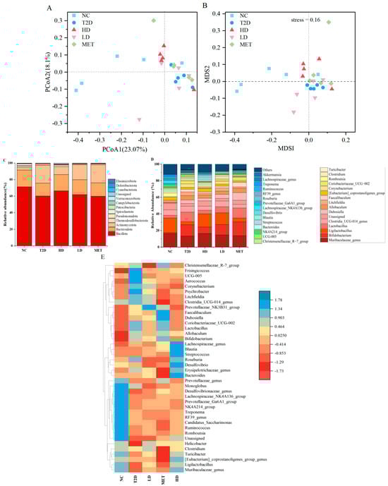 The impacts of different doses of GSP on the constituent profile of gut microbiota in T2D rats were analyzed via 16S rRNA sequencing. For α-diversity, coverage indices were close to 1, which indicates that sequences in samples were fully detected and the sequencing results were reliable and valid. Chao1 and ACE indices revealed that the NC group exhibited higher microbial richness compared to the T2D group, as presented in Table 3. During the intervention period, microbial richness (Chao1/ACE indices) gradually increased in the MET, LD, and HD groups. What is more, the HD group shows the most pronounced improvement. For β-diversity, community structure was evaluated by principal component analysis (PCA). As depicted in Figure 5A,B, microbial composition in the NC group exhibited marked separation from that of the T2D group, indicating distinct variations in microbiota composition were observed among the groups. Notably, Figure 5A,B revealed discernible divergence of the HD cohort from the T2D subjects and partial overlap with the NC controls, demonstrating GSP’s regulatory ability to restore gut microbiota toward a healthier state.