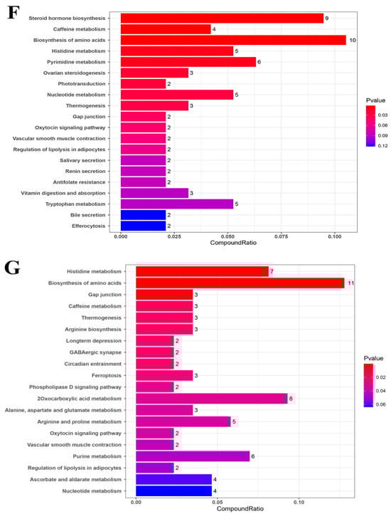 As depicted in Figure 6F, marked differences in metabolic pathways were identified between the NC and T2D groups, particularly in steroid hormone biosynthesis, biosynthesis of amino acids, histidine metabolism, pyrimidine metabolism, ovarian steroidogenesis, nucleotide metabolism, and bile secretion. These pathways are closely linked to steroid-related substances, amino acid synthesis, bile acid metabolism, energy homeostasis, and drug metabolism [27], which collectively suggest severe metabolic dysregulation in diabetic rats characterized by multiple aberrant biological processes.