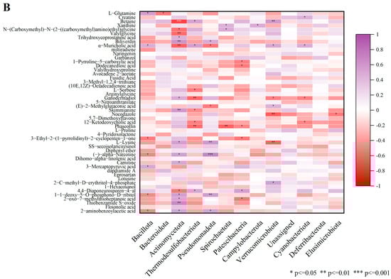 The evaluation of the correlation between some biochemical indexes and gut microbiota in rats was performed with Spearman’s correlation analysis. From Figure 7A, the abundance of Actinomycetota and Pseudomonadota exhibited positive correlations with INS, FBG, TG, TC, and LDL–C and negative associations with SCFAs, especially the alterations in acetic acid and butyric acid. Higher levels of Patescibacteria, Cyanobacteriota, and Deferribacterota were associated with reduced concentrations of INS, FBG, TC, and GSH–Px. The abundance of Thermodesulfobacteriota and Spirochaetota had positive associations with the changes in acetic acid and butyric acid and negative associations with the levels of INS, TG, TC, and LDL–C.