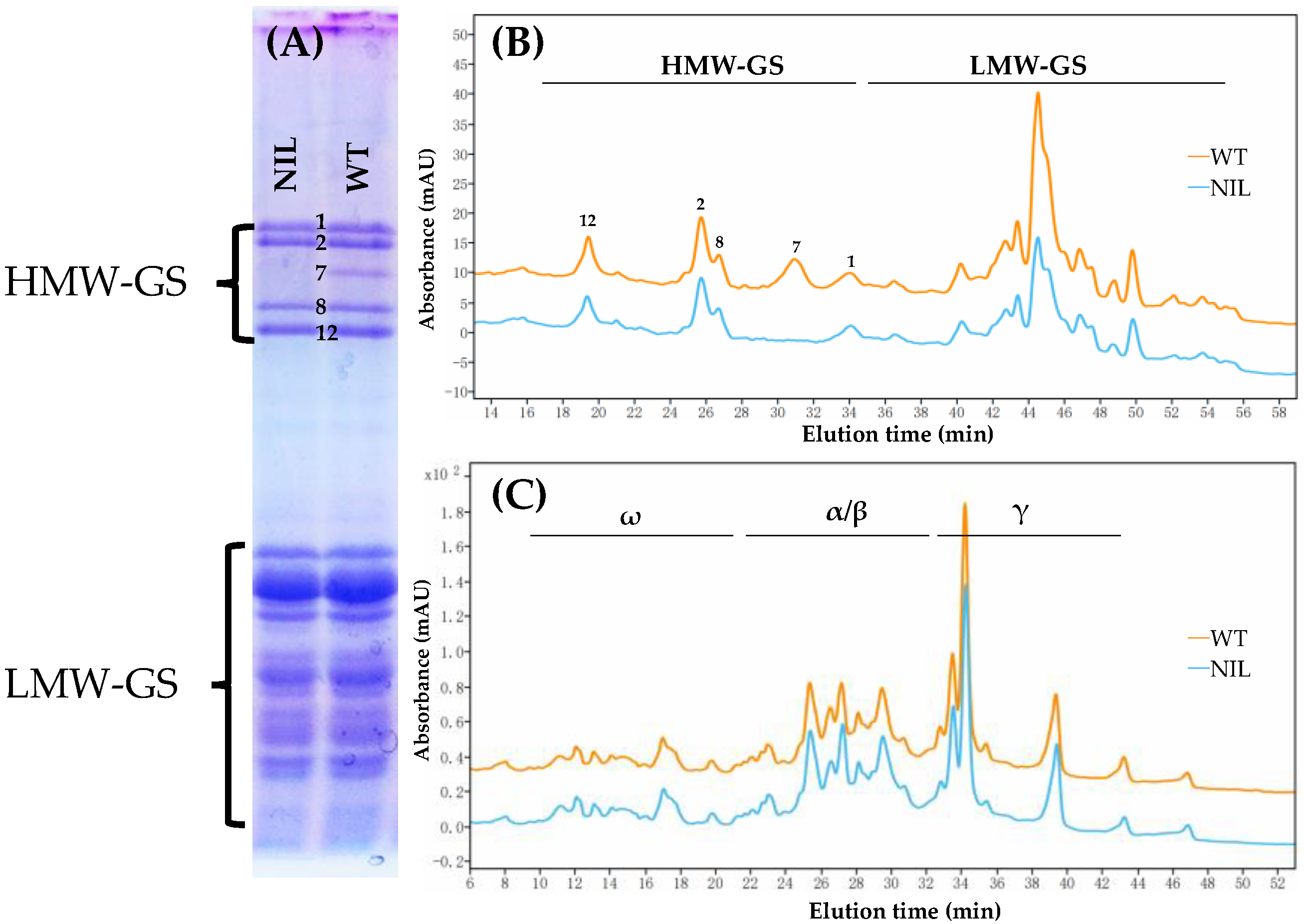 3.1. Composition of Gluten Proteins in WT and Its NIL