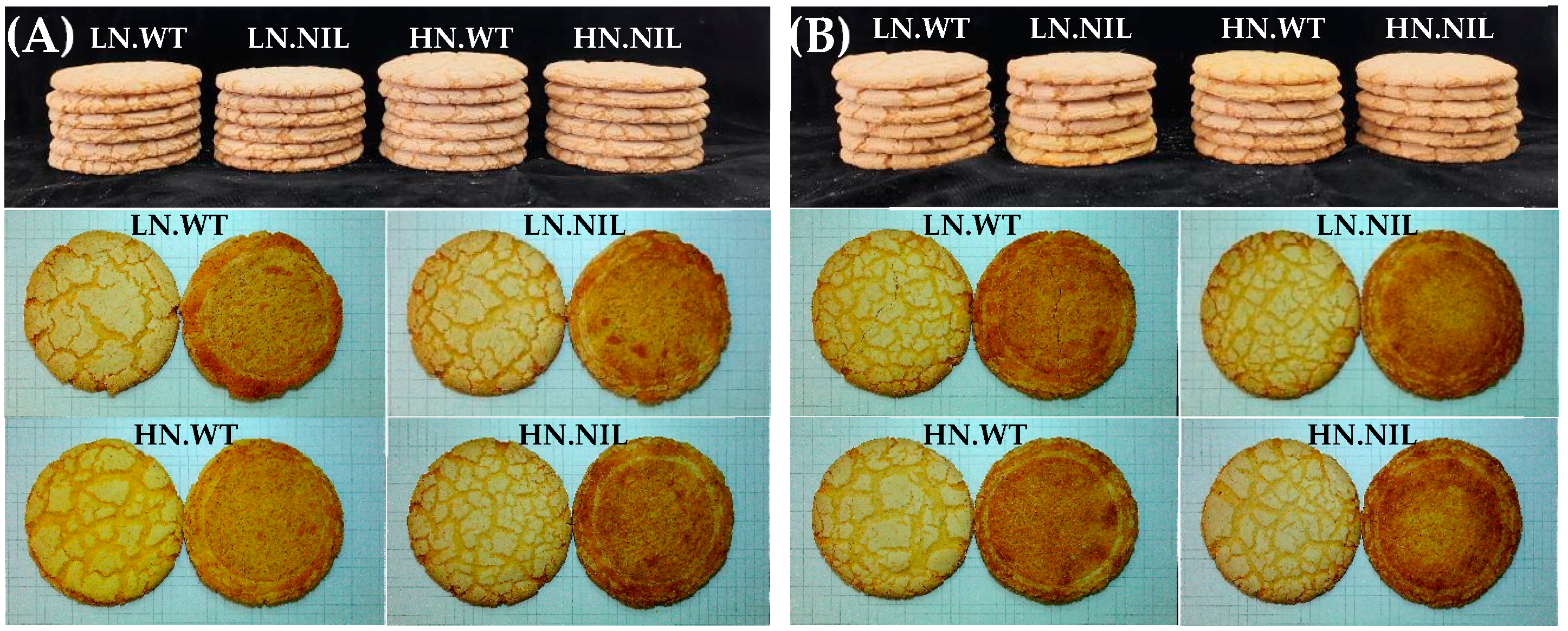 - Zhang, X.; Zhang, B.Q.; Wu, H.Y.; Lu, C.B.; Lü, G.F.; Li, D.T.; Li, M.; Jiang, W.; Song, G.H.; Gao, D.R. Effect of high-molecular-weight glutenin subunit deletion on soft wheat quality properties and sugar-snap cookie quality estimated through near-isogenic lines. J. Integr. Agric. 2018, 17, 1066–1073. [Google Scholar] [CrossRef]