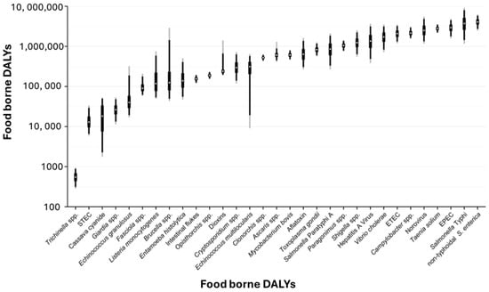 - Hoffmann, S.; White, A.E.; McQueen, R.B.; Ahn, J.-W.; Gunn-Sandell, L.B.; Walter, E.J.S. Economic Burden of Foodborne Illnesses Acquired in the United States. Foodborne Pathog. Dis. 2025, 22, 4–14. [Google Scholar] [CrossRef]