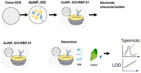 | Phage-based electrochemical biosensors | S. Typhimurium | Skim milk and lettuce | GCE | RBP 41, carboxylated GO, AuNPs, BSA | 0.298 Log10 CFU/mL | [70] |