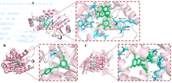 Molecular docking results. (A) CsgD, (B) FtsZ, (C) Chitin synthase A. Green color indicates the phenolic compound; Yellow color denotes hydrogen bonds; Blue color represents the linked amino acids.