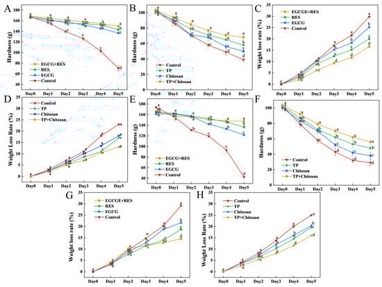 Effects of RES, EGCG, and TP on the hardness and weight loss rate of strawberries. Hardness of strawberries treated with RES/EGCG (A) and TP/chitosan (B) in uninoculated groups. Weight loss of strawberries treated with RES/EGCG (C) and TP/chitosan (D) in uninoculated groups. Hardness of strawberries inoculated with E. coli (E) or B. cinerea (F) and treated with the respective compounds. Weight loss of strawberries inoculated with E. coli (G) or B. cinerea (H) and treated with the respective compounds. Error bars represent SD (n = 3). Different lowercase letters indicate significant differences (p < 0.05) between treatments on the same day. RES: Resveratrol; EGCG: Epigallocatechin Gallate; TP: Tea Polyphenols.