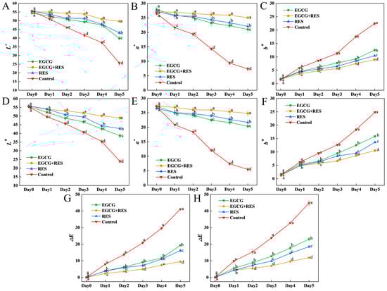 Effects of RES and EGCG on the color of strawberry infected with E. coli. The effects of RES and EGCG treatments on L*, a*, b*,and ΔE values in uninoculated (A–C,G) and E. coli-inoculated (D–F,H) groups. Data are presented as mean ± SD (n = 3). Different lowercase letters indicate significant differences (p < 0.05) between treatments on the same day. RES: Resveratrol; EGCG: Epigallocatechin Gallate.
