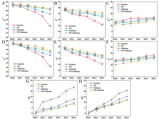 Effects of TP and chitosan on the color of strawberry infected with B. cinerea. The effects of TP and chitosan treatments on L*, a*, b*, and ΔE values in uninoculated (A–C,G) and B. cinerea-inoculated (D–F,H) groups. Data are presented as mean ± SD (n = 3). Different lowercase letters indicate significant differences (p < 0.05) between treatments on the same day. TP: Tea Polyphenols.