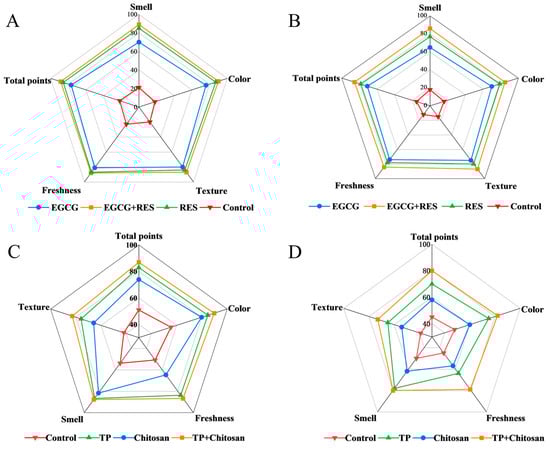 Effects of RES, EGCG, and TP on the sensory quality of strawberries. Effects of RES and EGCG in uninoculated (A) and E. coli-inoculated (B) strawberries. Effects of TP and chitosan in uninoculated (C) and B. cinerea-inoculated (D) groups. Error bars represent standard deviation (n = 10 panelists). RES: Resveratrol; EGCG: Epigallocatechin Gallate; TP: Tea Polyphenols.