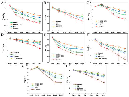 Effects of RES, EGCG, and TP on TA and SSC of strawberry. Effects of RES and EGCG on TA and SSC in uninoculated (A,C) and E. coli-inoculated (E,G) groups, respectively. Effects of TP and chitosan on TA and SSC in uninoculated (B,D) and B. cinerea-inoculated (F,H) groups, respectively. Data are presented as mean ± SD (n = 3). Different lowercase letters indicate significant differences (p < 0.05) between treatments within the same group. RES: Resveratrol; EGCG: Epigallocatechin Gallate; TP: Tea Polyphenols; TA: Titratable acid; SSC: soluble solids content.