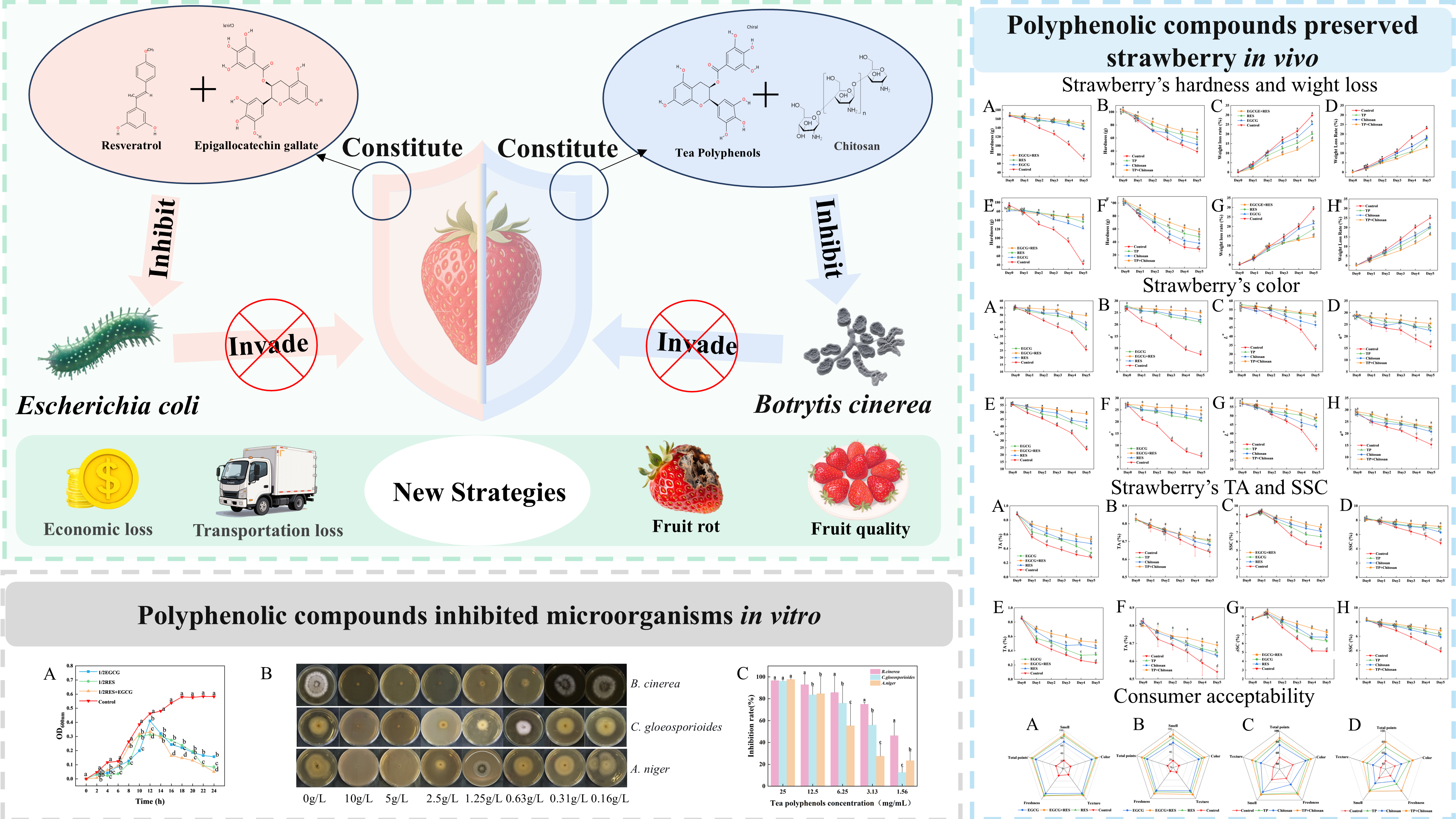 This study aims to explore the antimicrobial effects of RES, EGCG, and TP in vitro, and their preservation effects on strawberry in vivo. We determined the antimicrobial activities of RES, EGCG, and TP against E. coli and B. cinerea. Then, we evaluated how these compounds, applied singly or in combination, influenced the hardness, weight loss, color retention, sensory qualities, and nutritional composition of strawberries stored in natural environment of infected by E. coli or B. cinerea. This study will provide data support for further exploring their potential in targeted scenarios.