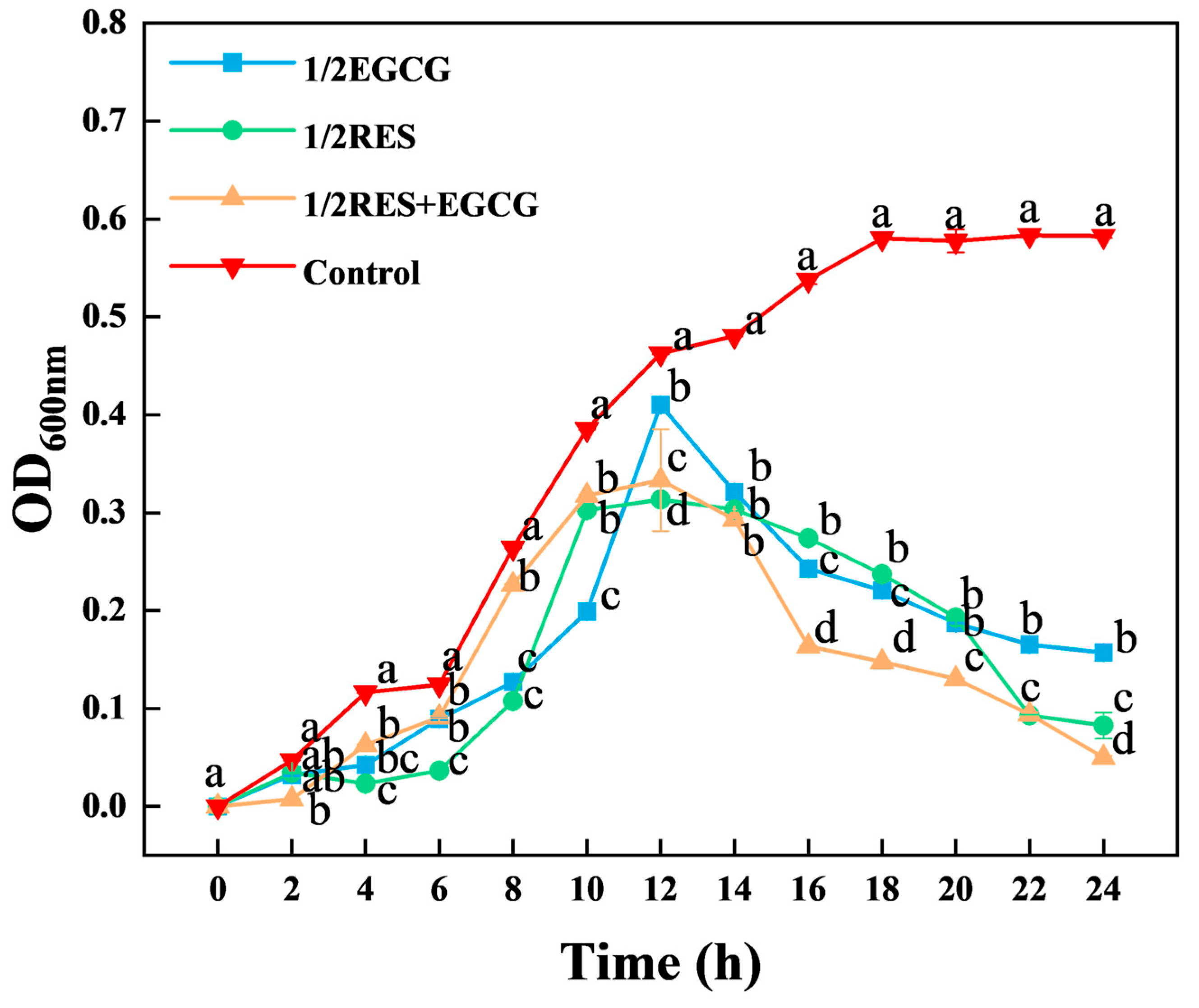 Figure 1. Effects of RES and EGCG on the growth of E. coli. Group designations: Control (no drug), 1/2 EGCG (1/2 MIC of EGCG), 1/2 RES (1/2 MIC of RES), and 1/2 RES+EGCG (combination of 1/2 MIC of both RES and EGCG). Data are presented as mean ± SD (n = 3). Different lowercase letters above bars denote significant differences (p < 0.05). RES: Resveratrol; EGCG: Epigallocatechin Gallate.