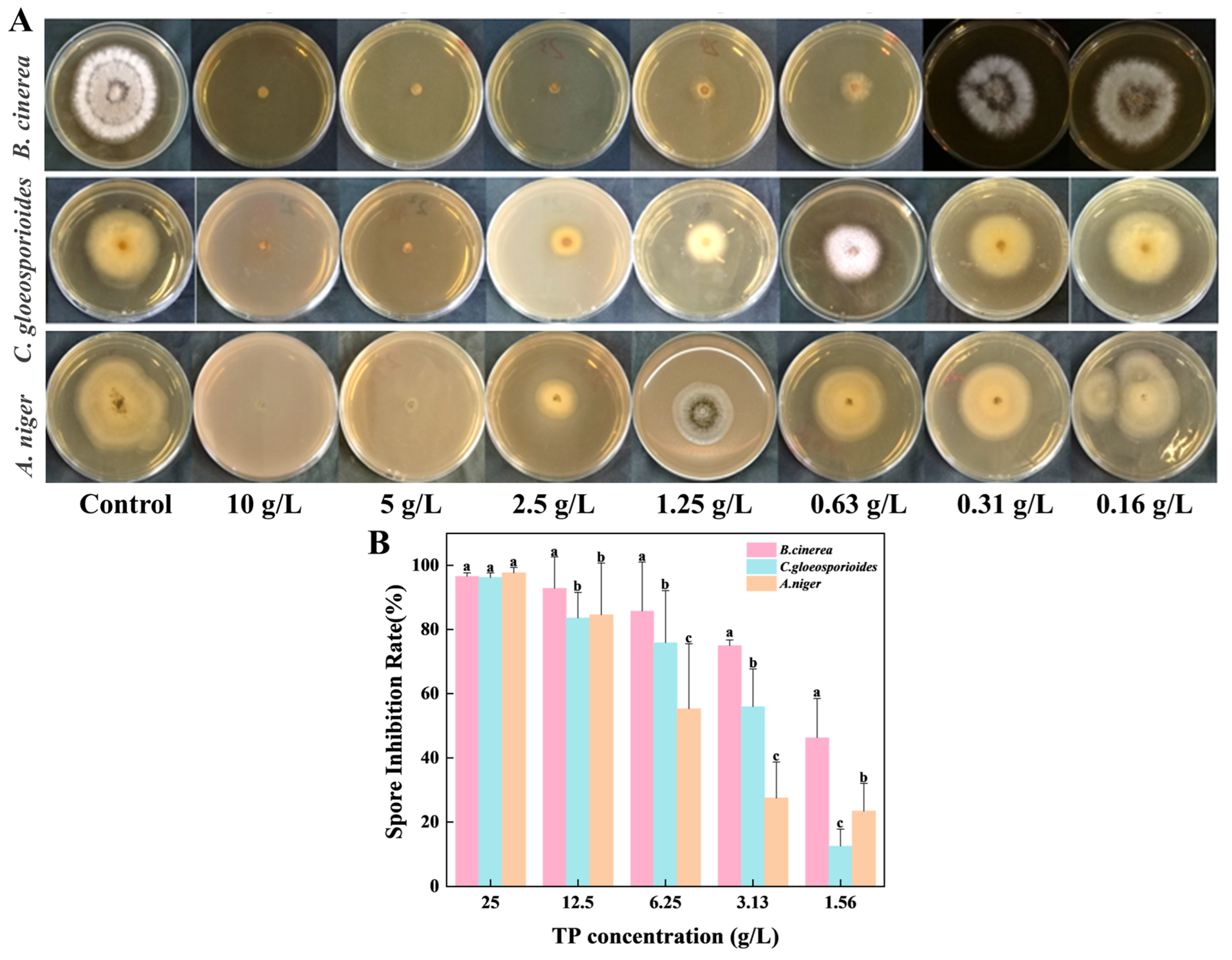 The spore inhibition activity of TP against three fungal pathogens (B. cinerea, C. gloeosporioides, and A. niger) was evaluated by microbroth dilution assay [33]. Spore suspensions (106~107 CFU/mL) obtained from PDA plate cultures were tested in 96-well plates containing PDB medium supplemented with TP at concentrations from 0.39 to 25 g/L. Each well was inoculated with 1% (v/v) of spore suspension and incubated statically at 25 °C for 24 h in the dark. Absorbance was measured at 530 nm (OD530), with appropriate controls and three replicates included for each treatment.