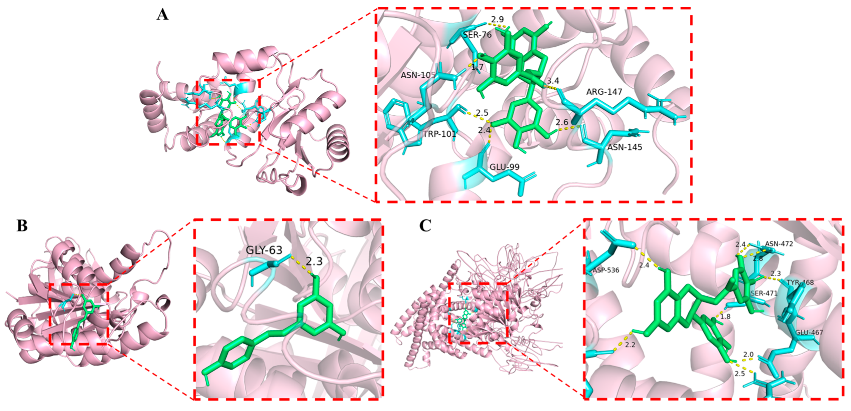 Figure 3. Molecular docking results. (A) CsgD, (B) FtsZ, (C) Chitin synthase A. Green color indicates the phenolic compound; Yellow color denotes hydrogen bonds; Blue color represents the linked amino acids.