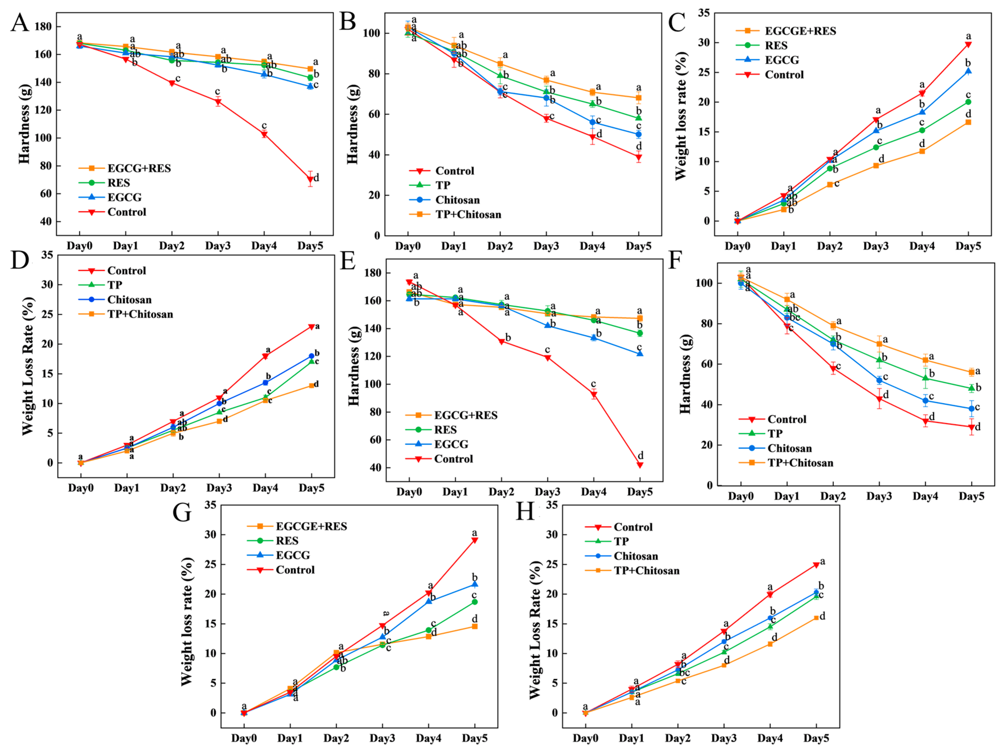 Figure 4. Effects of RES, EGCG, and TP on the hardness and weight loss rate of strawberries. Hardness of strawberries treated with RES/EGCG (A) and TP/chitosan (B) in uninoculated groups. Weight loss of strawberries treated with RES/EGCG (C) and TP/chitosan (D) in uninoculated groups. Hardness of strawberries inoculated with E. coli (E) or B. cinerea (F) and treated with the respective compounds. Weight loss of strawberries inoculated with E. coli (G) or B. cinerea (H) and treated with the respective compounds. Error bars represent SD (n = 3). Different lowercase letters indicate significant differences (p < 0.05) between treatments on the same day. RES: Resveratrol; EGCG: Epigallocatechin Gallate; TP: Tea Polyphenols.