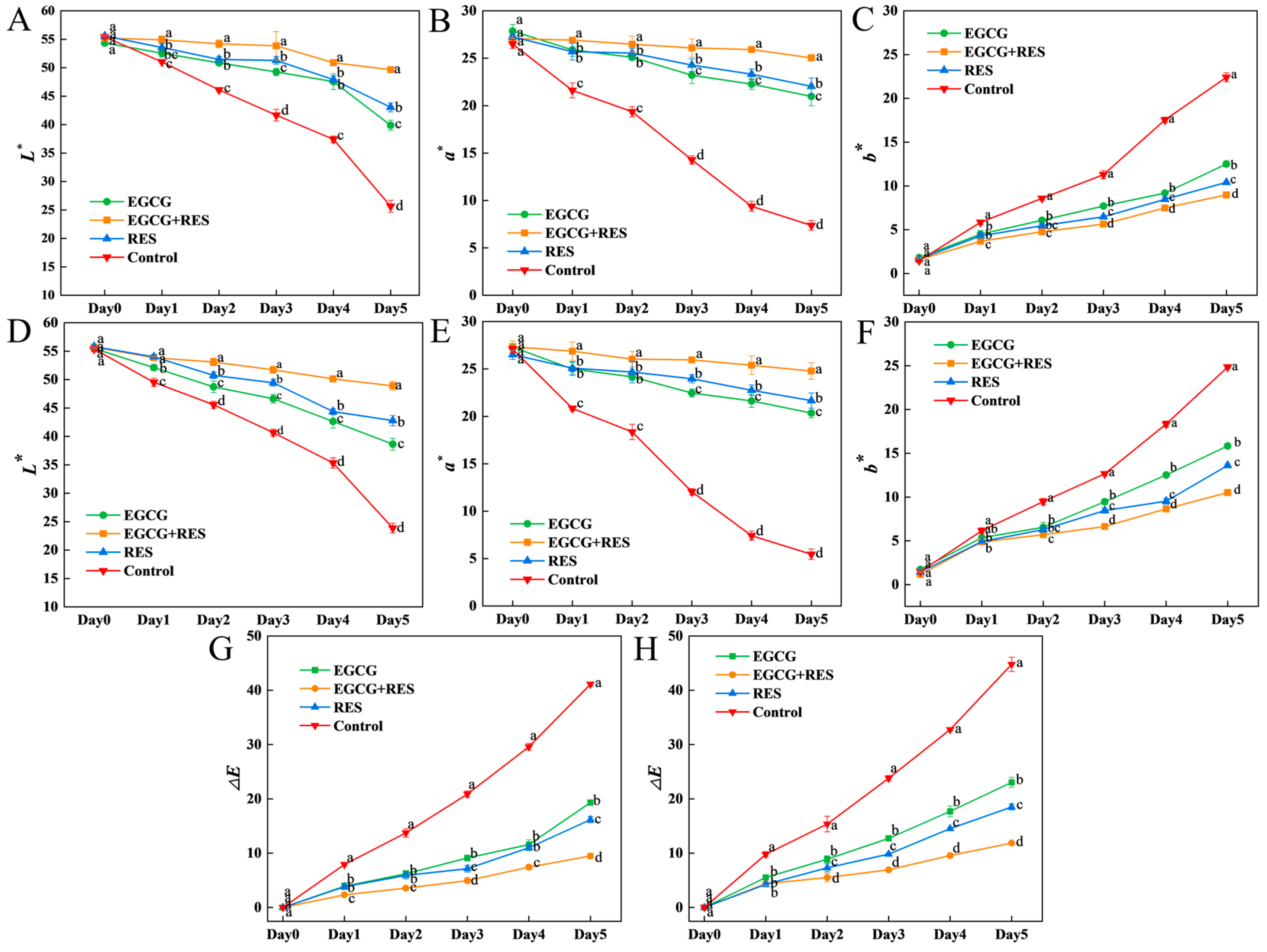 Figure 5. Effects of RES and EGCG on the color of strawberry infected with E. coli. The effects of RES and EGCG treatments on L*, a*, b*,and ΔE values in uninoculated (AC,G) and E. coli-inoculated (DF,H) groups. Data are presented as mean ± SD (n = 3). Different lowercase letters indicate significant differences (p < 0.05) between treatments on the same day. RES: Resveratrol; EGCG: Epigallocatechin Gallate.