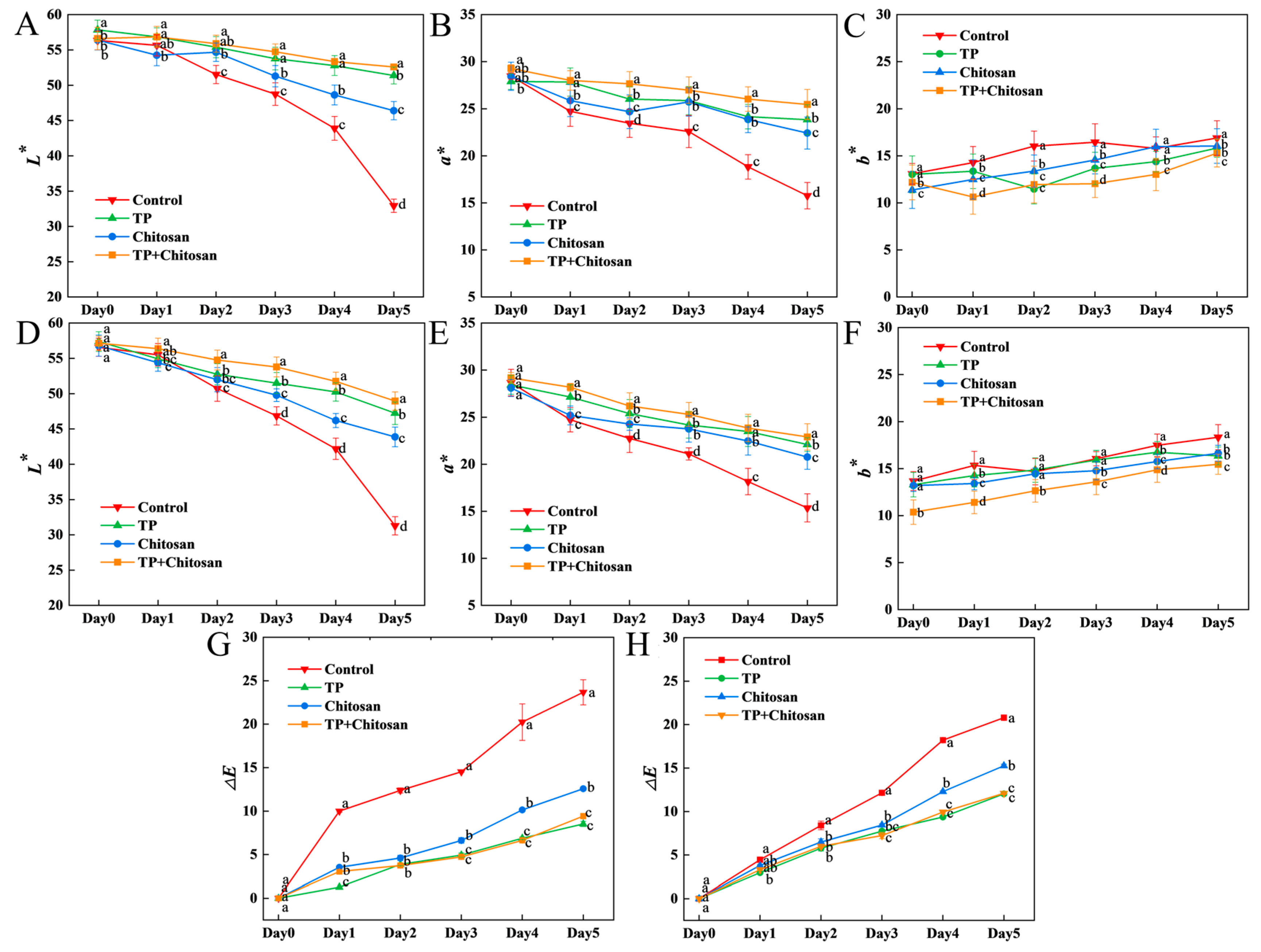 Figure 6. Effects of TP and chitosan on the color of strawberry infected with B. cinerea. The effects of TP and chitosan treatments on L*, a*, b*, and ΔE values in uninoculated (AC,G) and B. cinerea-inoculated (DF,H) groups. Data are presented as mean ± SD (n = 3). Different lowercase letters indicate significant differences (p < 0.05) between treatments on the same day. TP: Tea Polyphenols.