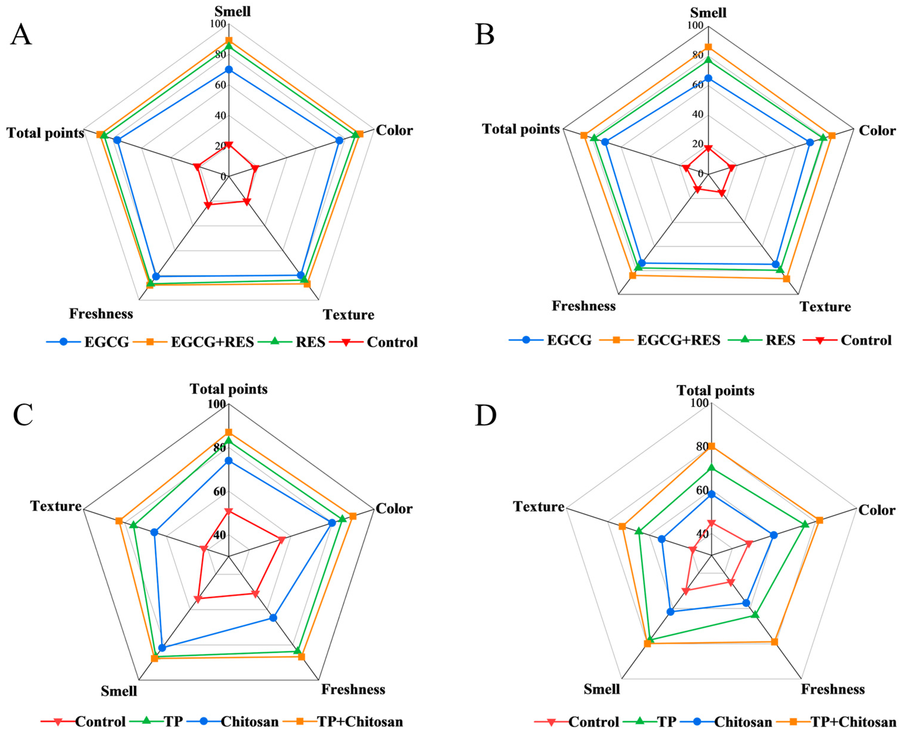Figure 7. Effects of RES, EGCG, and TP on the sensory quality of strawberries. Effects of RES and EGCG in uninoculated (A) and E. coli-inoculated (B) strawberries. Effects of TP and chitosan in uninoculated (C) and B. cinerea-inoculated (D) groups. Error bars represent standard deviation (n = 10 panelists). RES: Resveratrol; EGCG: Epigallocatechin Gallate; TP: Tea Polyphenols.