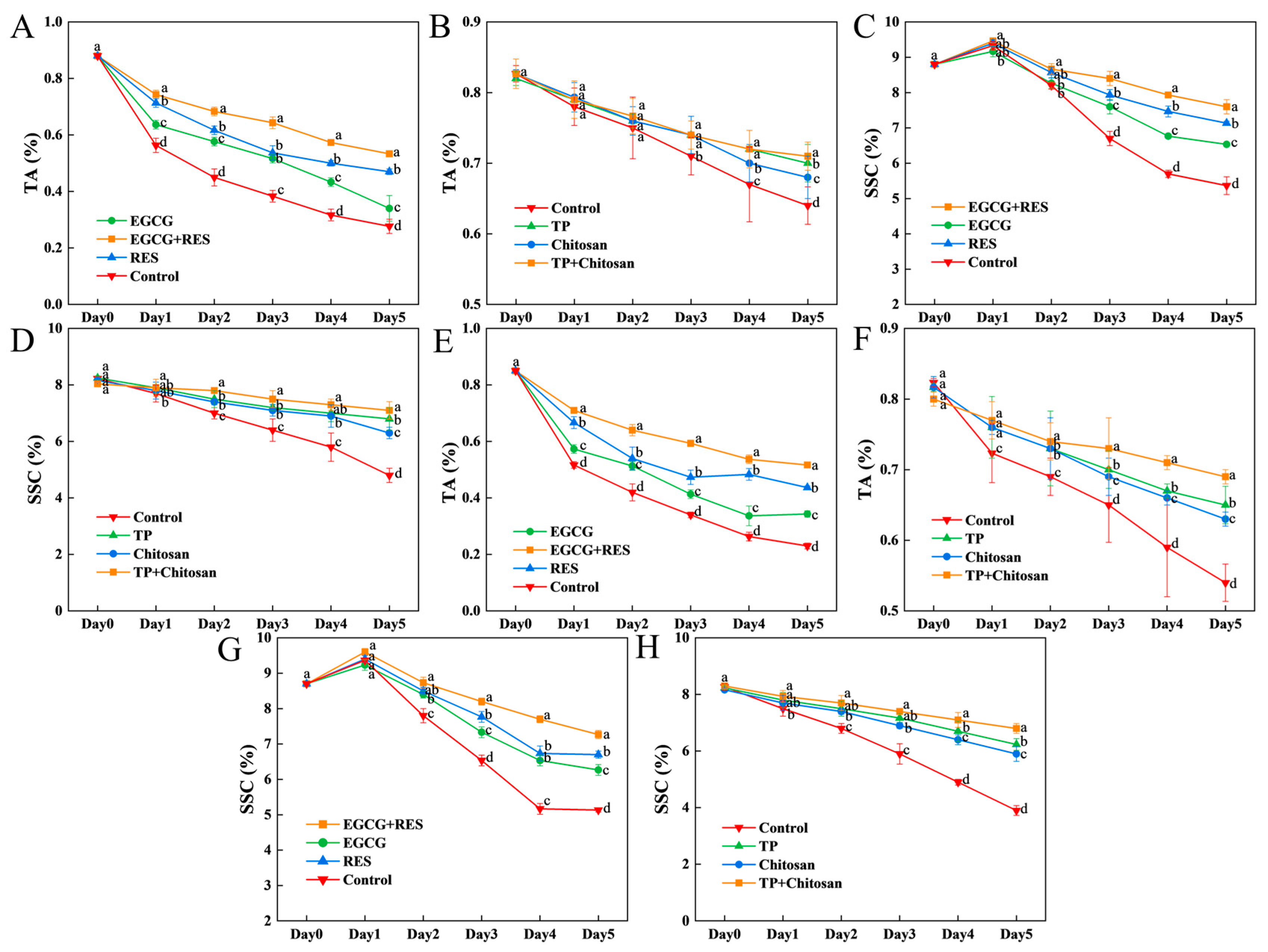 Figure 8. Effects of RES, EGCG, and TP on TA and SSC of strawberry. Effects of RES and EGCG on TA and SSC in uninoculated (A,C) and E. coli-inoculated (E,G) groups, respectively. Effects of TP and chitosan on TA and SSC in uninoculated (B,D) and B. cinerea-inoculated (F,H) groups, respectively. Data are presented as mean ± SD (n = 3). Different lowercase letters indicate significant differences (p < 0.05) between treatments within the same group. RES: Resveratrol; EGCG: Epigallocatechin Gallate; TP: Tea Polyphenols; TA: Titratable acid; SSC: soluble solids content.
