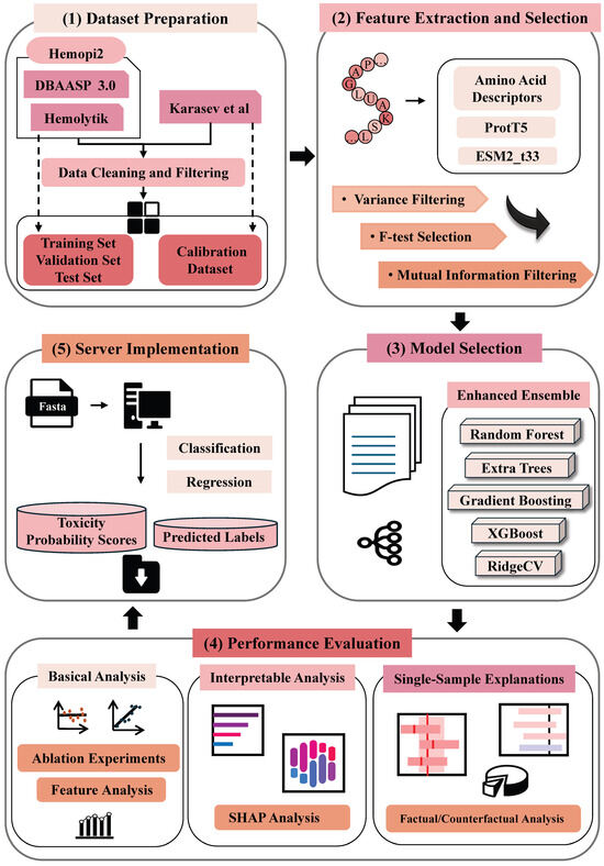 Workflow of Hemolytic Peptide Toxicity Prediction: (1) Dataset Preparation; (2) Feature Extraction and Selection; (3) Model Selection; (4) Performance Evaluation; (5) Server Implementation.