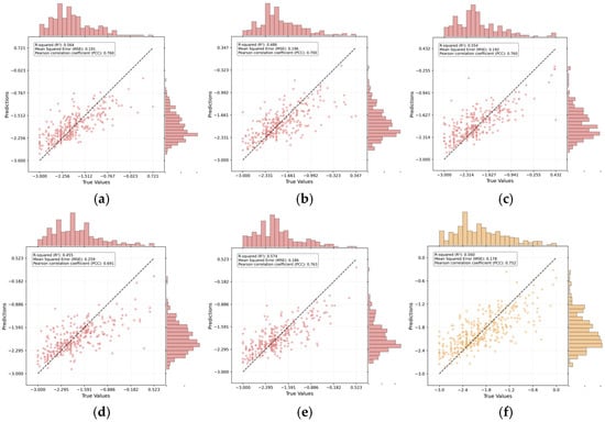 Scatter plot of −log(HC50), (a–e) Scatter plots of predicted versus true −log(HC50) values from the five-fold cross-validation on the training set. The solid line in each panel represents the line of perfect prediction (y = x). The corresponding performance metrics (R2, MSE, PCC) for each fold are annotated within the plots. (f) Scatter plot of predicted versus true -log(HC50) values on the independent test set.