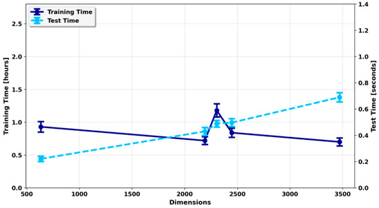 To further evaluate practical performance, we investigated computational efficiency under varying dimensional complexity. As model dimensionality increased, testing time rose correspondingly from 0.221 s to 0.690 s (Figure 4), reflecting the higher computational burden of larger feature spaces. Training time exhibited more complex behavior: although it remained relatively stable overall, slight decreases were observed within certain dimensional ranges, likely due to optimization dynamics or hardware utilization differences. In general, testing time was more sensitive to dimensionality, whereas training time was influenced by multiple interacting factors, including model complexity and system performance.