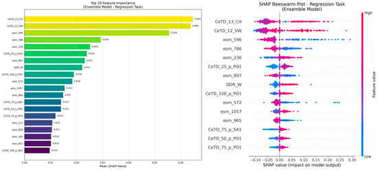 Top 20 features utilized in the regression model. The left bar plot shows the ranked features, with importance calculated by averaging Shapley values over the Sreg test dataset. The right beeswarm plot illustrates the influence of different feature values on the prediction.