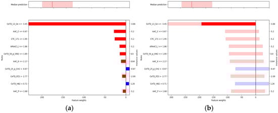 In the baseline interpretability analysis of the Hemopi2 dataset (Figure 6a), the model generated a calibrated prediction for the selected test peptide. The upper panel shows a predicted median HC50 of approximately 300.9 μM (red line), with the shaded area indicating the 90% confidence interval (5th–95th percentiles). This indicates that the true HC50 value is expected to fall within this range. The lower panel illustrates the contributions of key features to the prediction: negative weights (red) represent features that decrease the predicted HC50, whereas positive weights (blue) indicate features that increase it.