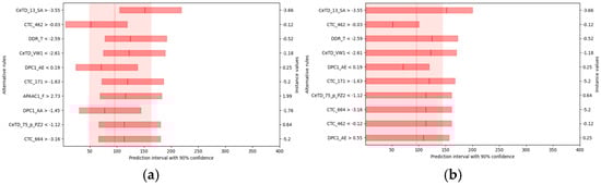 (a) The counterfactual plot for the hemolytic peptide dataset. (Each row represents a rule, showing its median (solid line) and 5th–95th percentile confidence interval. The overall background provides the original instance’s confidence interval for reference); (b) One-sided counterfactual plot using the 90th upper percentile only to define confidence intervals, demonstrating the effect of conditional violations.