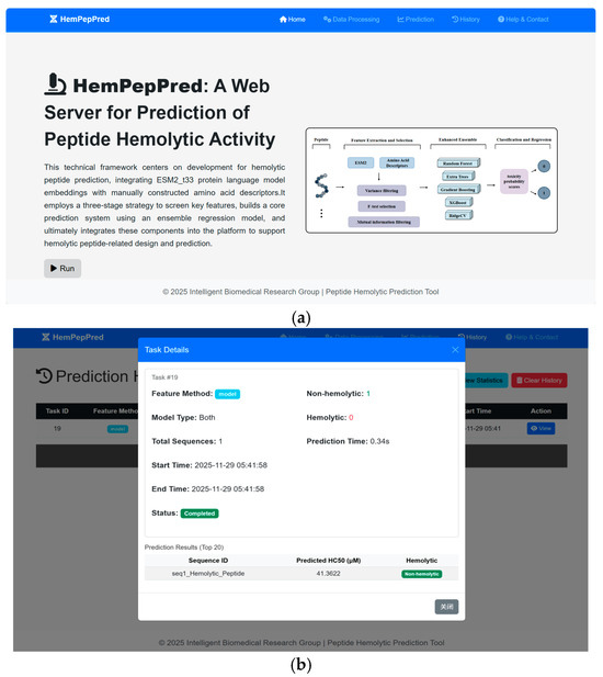 Building upon our ensemble learning framework, we developed a web server (HemPepPred) for high-throughput peptide toxicity prediction, available at http://hem.cqudfbp.net (accessed on 22 October 2025). Users can submit sequence data on the main page (Figure 8a) and download the resulting outputs for further analysis (Figure 8b). The platform supports batch processing and automates the entire analytical pipeline—from sequence validation and statistical summarization to feature extraction, model prediction, and report generation.