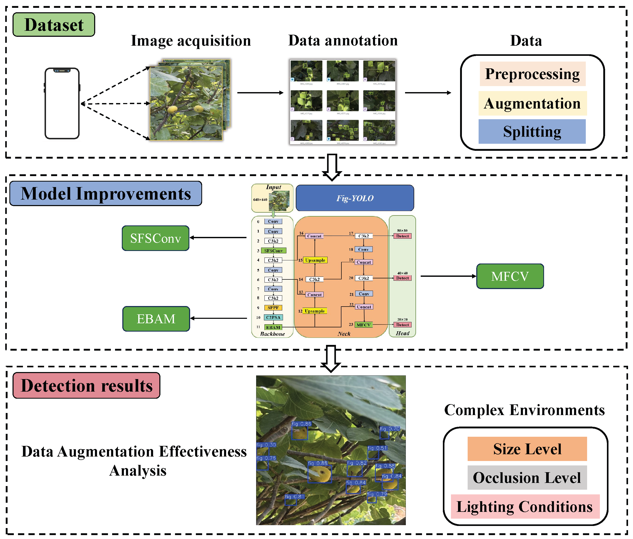 To address the above issues, we propose the Fig-YOLO model. Existing YOLOv11 enhancement studies primarily focus on improving detection accuracy or inference speed in general scenarios, yet they still exhibit limitations in feature extraction when applied to specific agricultural environments. To address the challenges commonly observed in complex fig orchard scenes, Fig-YOLO introduces dedicated feature enhancement structures to improve detection accuracy and stability in crop-specific settings, and conducts targeted evaluations in representative scenarios. Therefore, the innovation of Fig-YOLO lies in task-driven, scenario-oriented optimization rather than routine performance tuning of YOLOv11. In addition, Fig-YOLO not only improves detection accuracy but also provides applications with practical agronomic significance. Accurate fruit localization enables the estimation of fruit load and spatial distribution, which are essential for yield prediction, field-scale growth monitoring, and harvesting route planning. Enhanced boundary recognition also improves the reliability of subsequent phenotypic measurements, such as fruit maturity assessment, thereby supporting precision orchard management. By integrating visual detection results with agronomic variables, Fig-YOLO offers actionable insights for practical production beyond a purely technical case study. The specific objectives are as follows: